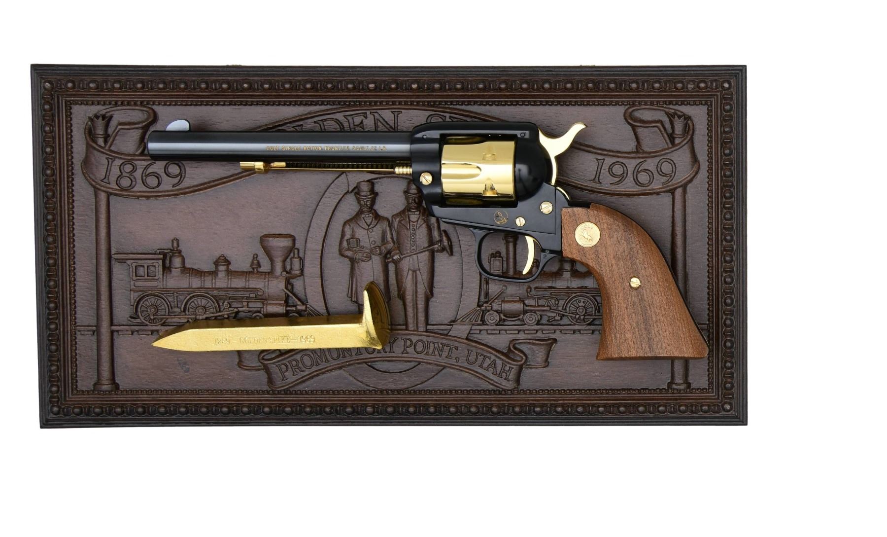 Cal. 22 LR. S# 9302GS. Bbl. 4 3/4" Mfg. 1969 in celebration of Transcontinental Railroad completion at Promontory Point, Utah; 11,000 units. Blued with gold plated fluted cylinder, loading gate, ejector housing (blued screw), ejector rod head, screws and base pin. Rough textured walnut grips with gold Colt medallions plus scroll engraving on butt. Gold fill in all barrel lettering. More produced than for any other Colt commemorative model along with a similar commemorative by Winchester (Model 94 Carbine), yet highly sought after due to its fine appearance and universal historic appeal. UNATTACHED ACCESSORIES: Colt supplied moulded presentation case resembling Gutta Percha having 2 facing steam engines plus 2 top-hatted dignitaries on top of lid plus a reproduction (under lid) of the famous meeting photograph as the golden spike is driven. Bottom of case is outlined in vivid dark green velvet for revolver and commemorative gold plated railroad spike. Case lid hinges hand separate to allow a more varied display. Occasional very light marks on case lid. CONDITION: all aspects near excellent appearing new and unfired. (24-4811/NW). CURIO. $500-750.