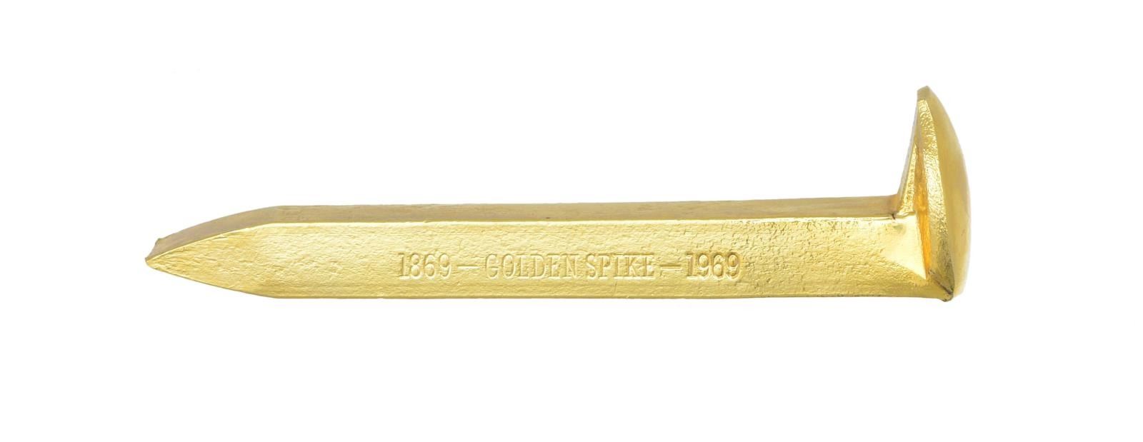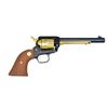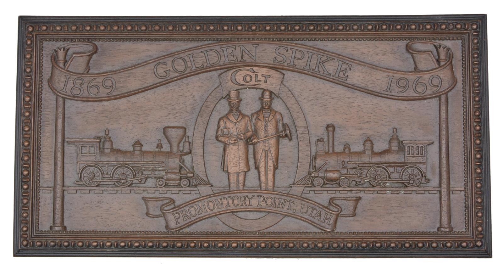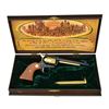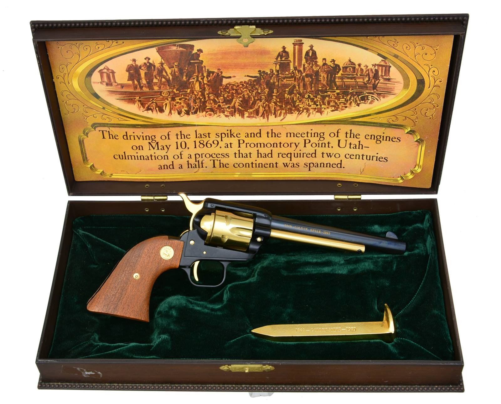 Cal. 22 LR. S# 8336GS. Bbl. 6" w/ blue finish & blade sight. Black anodized frame & grip straps. 6 Shot fluted cyl. Cyl., ejector housing, hammer, trigger & sm. parts have gold finish. 2 Piece synthetic wood grain grips w/ gold Rampant Colt medallions. Total production of 11,000 mfg. 1969. UNATTACHED ACCESSORIES: wood grain plastic box w/ green velour fitted interior. Outside lid of box has raised locomotive scene commemorating the golden spike at Promontory Point. Inside lid of box has Utah scene. Box contains gold finished spike, instruction manual & gold spike booklet. CONDITION: appears unfired. Gold finished parts show slight edge wear. Bottom of frame & trigger guard show handling marks. Near excellent bore. (21-4395/DS). CURIO. $500-700.