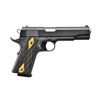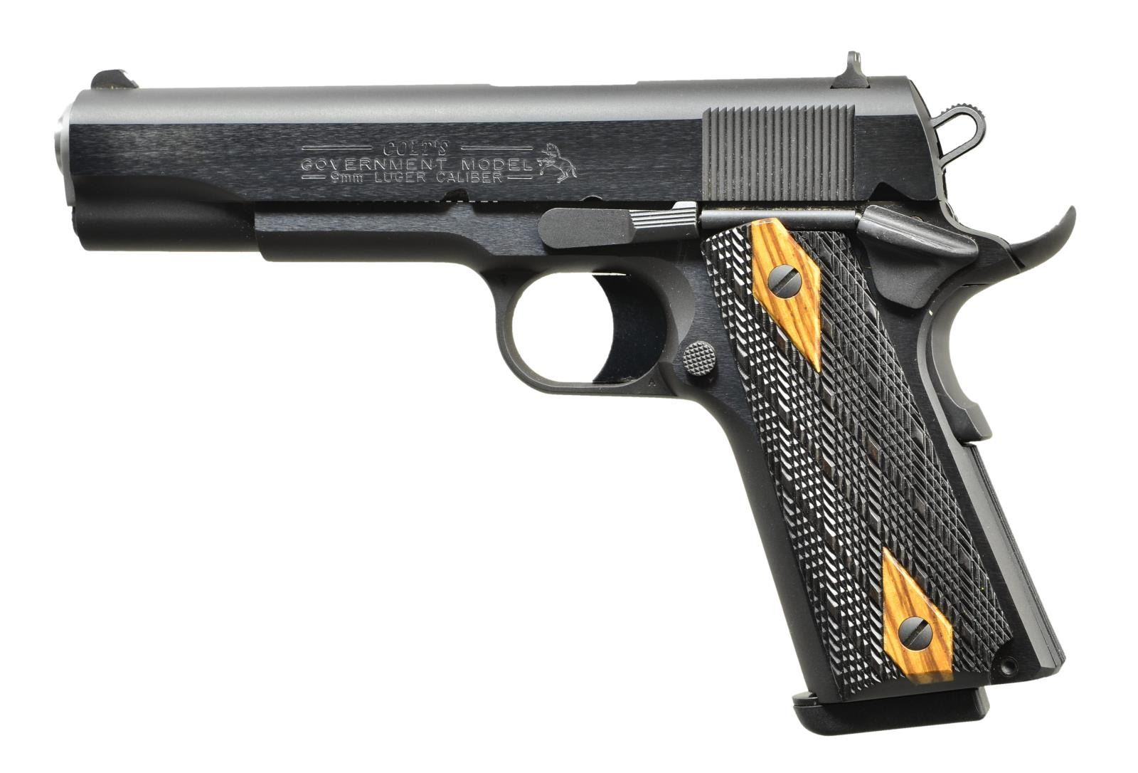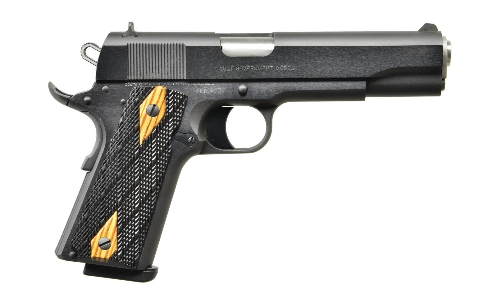 Cal. 30 Luger. S# NN04937. Bbl. 5". Colt Government Model originally chambered in 9mm Luger, with a fitted BarSto .30 Luger stainless steel bbl. Satin finish matching slide & receiver w/ attractive Gaboon ebony double diamond "Wood Caliber" grips w/ Zebra wood inlays. Extended beavertail grip safety. Serrated skeletonized hammer. Serrated slide w/ traditional 3 dot sights. Mag: 2 steel 9 rd. mags. UNATTACHED ACCESSORIES: plastic carry case. Original 9mm Luger bbl., bushing, spring, beavertail safety & hammer. CONDITION: All outward appearances indicate very little use. Tiny amt. of thinning on top of slide & in areas of mechanical intervention. Bright bore w/ strong rifling in both bbls. Fire control mechanism appears to function correctly when cycled by hand. (22-1802/JZ) MODERN $1,000-1,500.