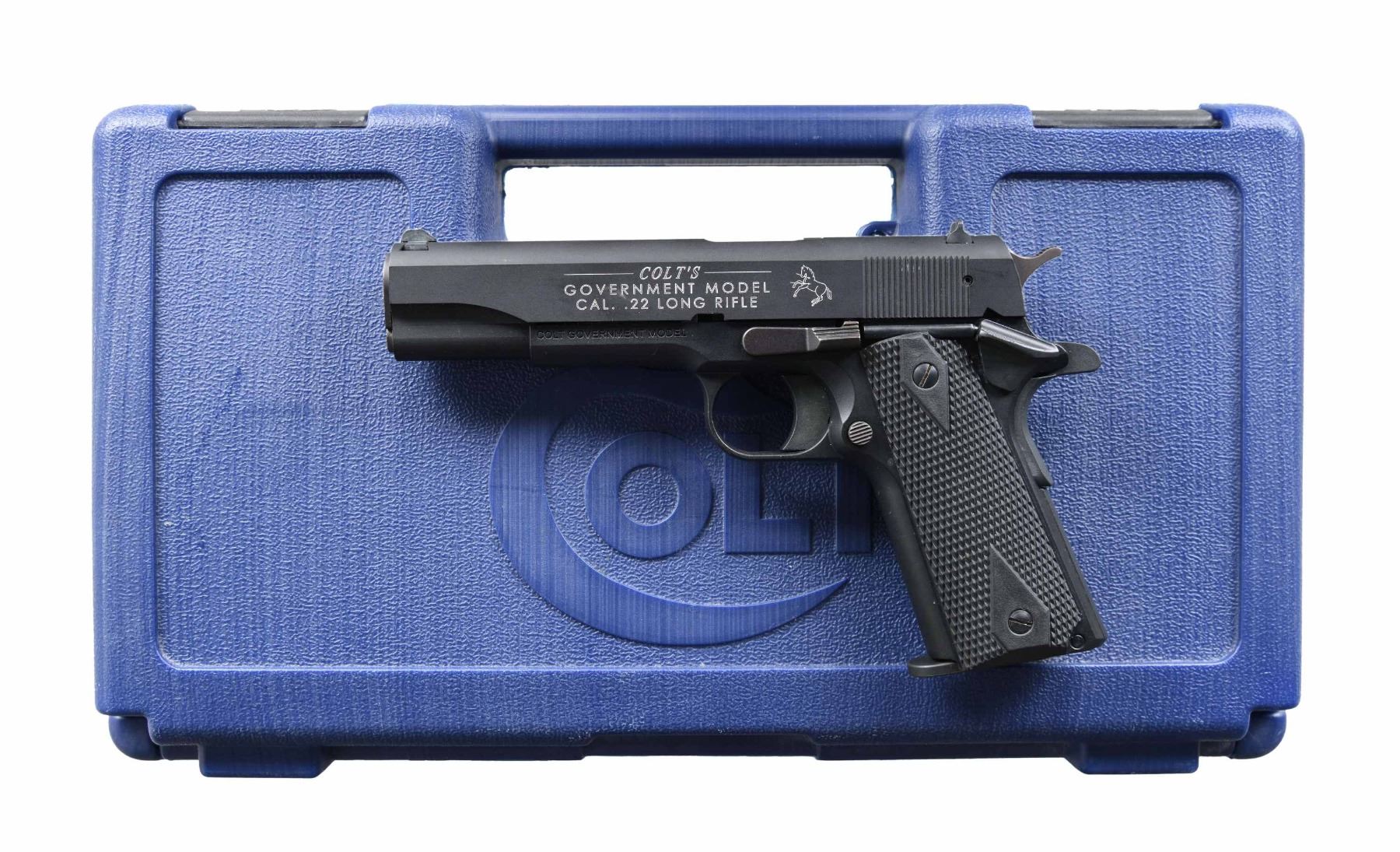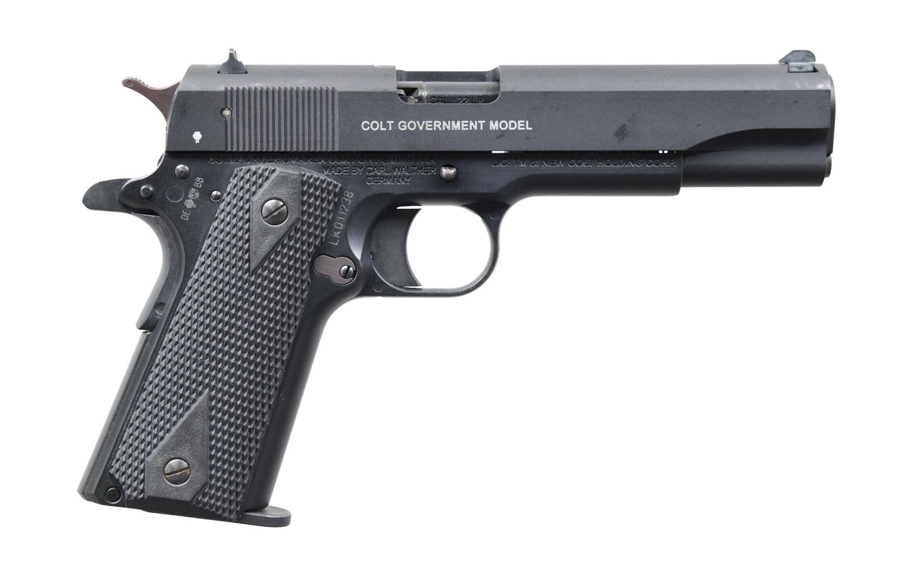 Cal. 22 LR. S# LK011238. Bbl. 5". GI style sights. German rimfire 1911 style pistol made by Umarex & licensed by Colt. Matte black finish. Checkered rubber grips. MAGS: 2-10 rd. UNATTACHED ACCESSORIES: replacement Colt hardcase with Series 80 manual, trigger lock & two spare triggers. CONDITION: metal & grips show scattered scuffs & handling marks. Action functions properly when hand cycled. Bright very good + bore. (24-6413/MJC). MODERN. $300-400.
