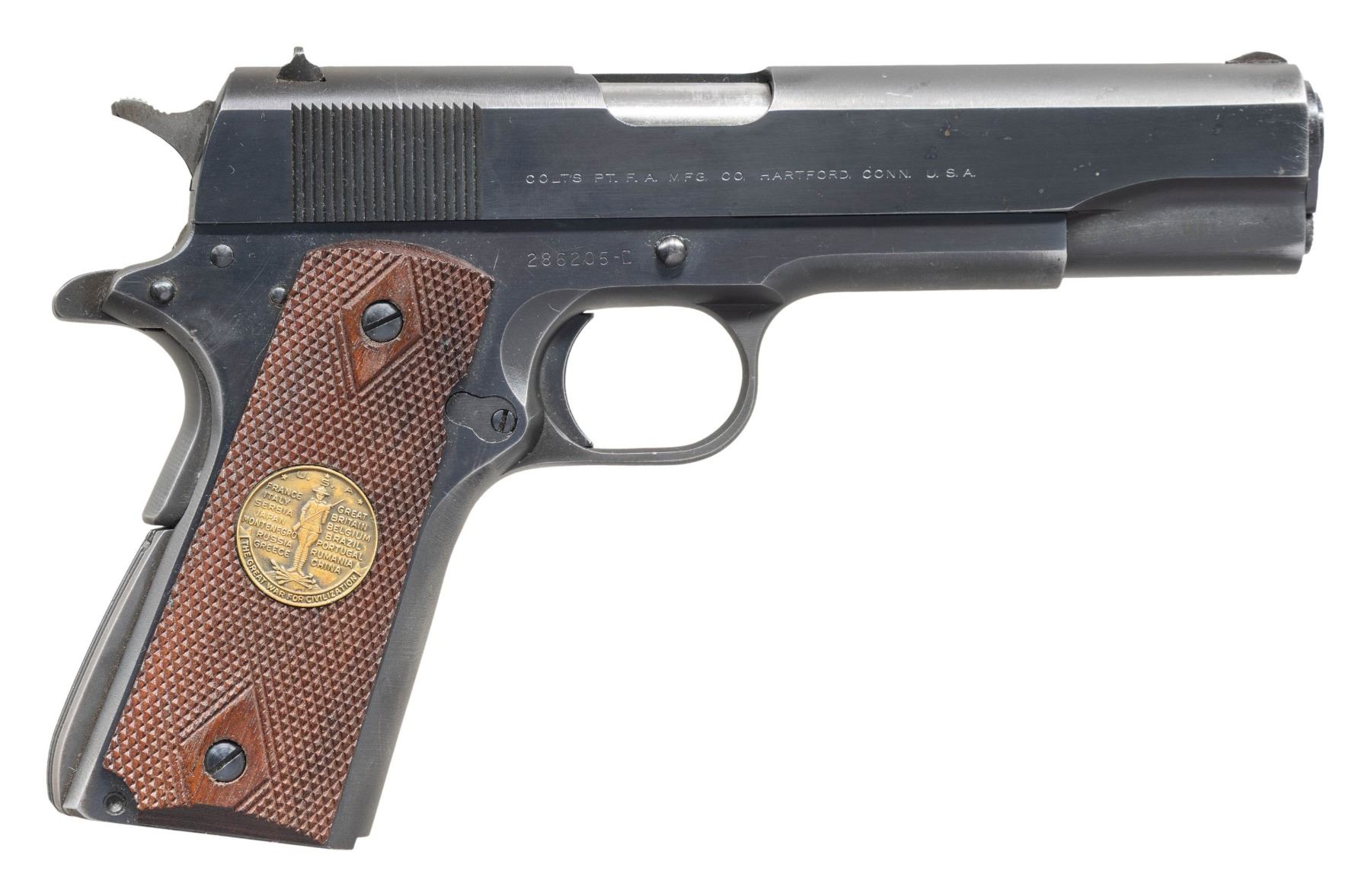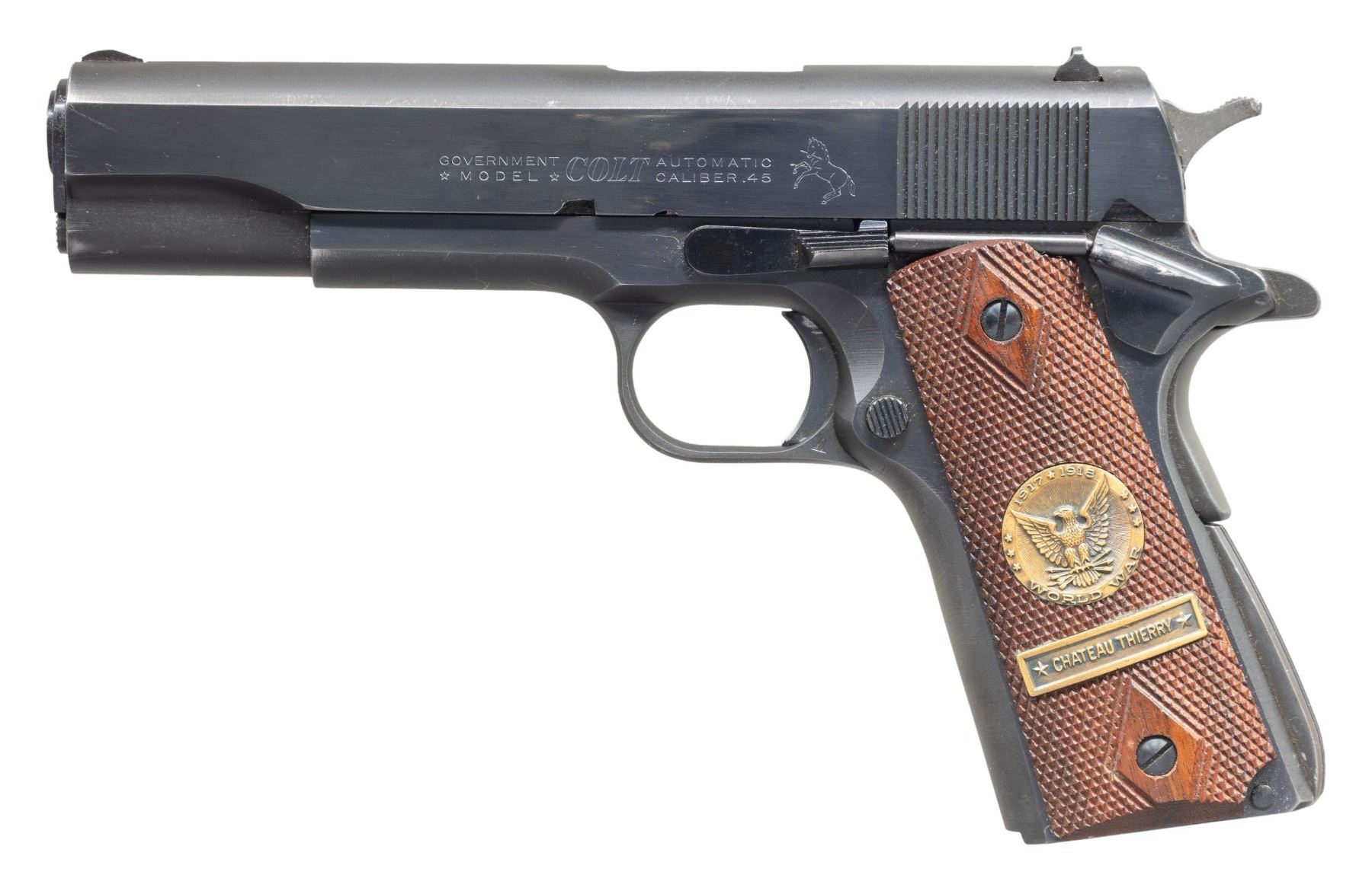 Cal. 45 ACP. S# 286205-C. Bbl. 5" marked "COLT 45 AUTO" on top. GI 1911 style sights. 1960 made Government model pistol. Blued finish. Replacement Chateau Thierry commemorative grips. MAGS: none present. CONDITION: grips show light handling wear. Metal retains 92% original blue with some light oxidation on slide, a slide stop reassembly scratch on frame & some edge wear. Action functions properly when hand cycled. Good bore with dried grease & some light oxidation but strong rifling. (25-4665/MJC). CURIO. $600-900.