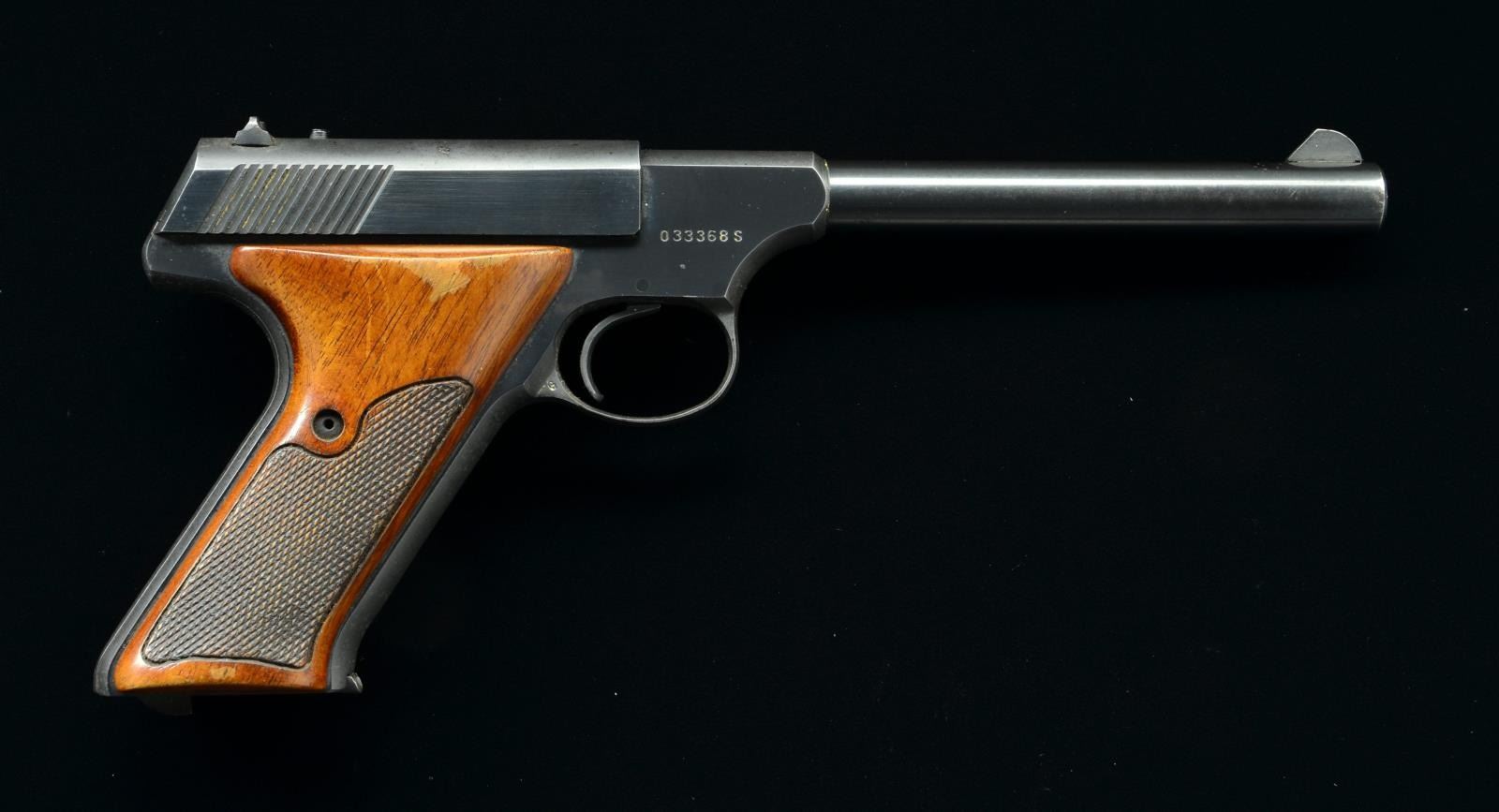 Cal. 22 LR. S# 033368S (1972). Bbl. 6 1/4". Serrated ramp front sight & square notch rear sight. Blue finish 2 Piece checkered walnut grips. Mag. release at heel. MAGS: 1-10 rd. CONDITION: good to very good overall appearance w/ muzzle wear, patina, pinprick oxidation & handling marks throughout. Very good bore. (22-1428/MD). MODERN. $350-600.