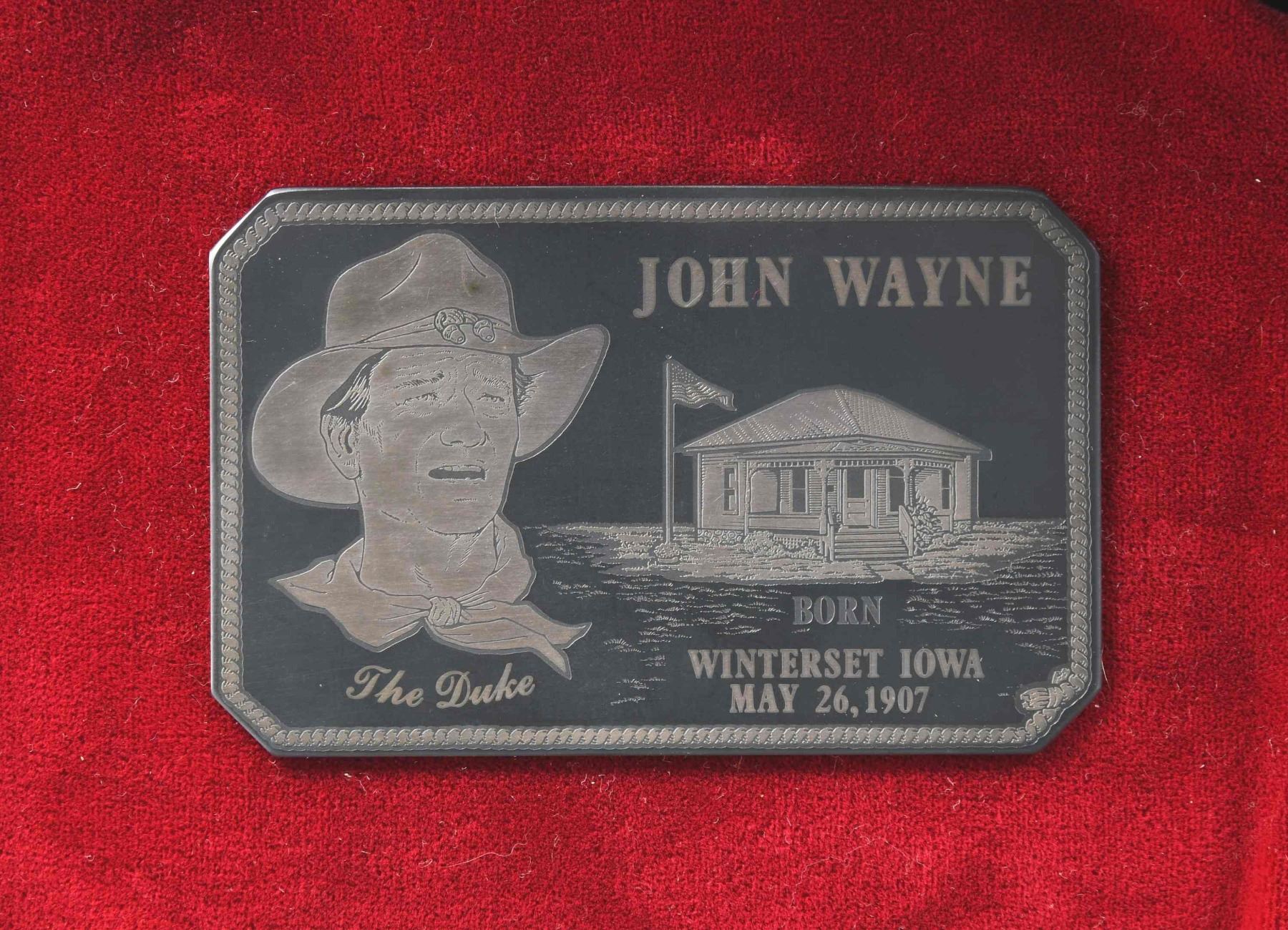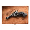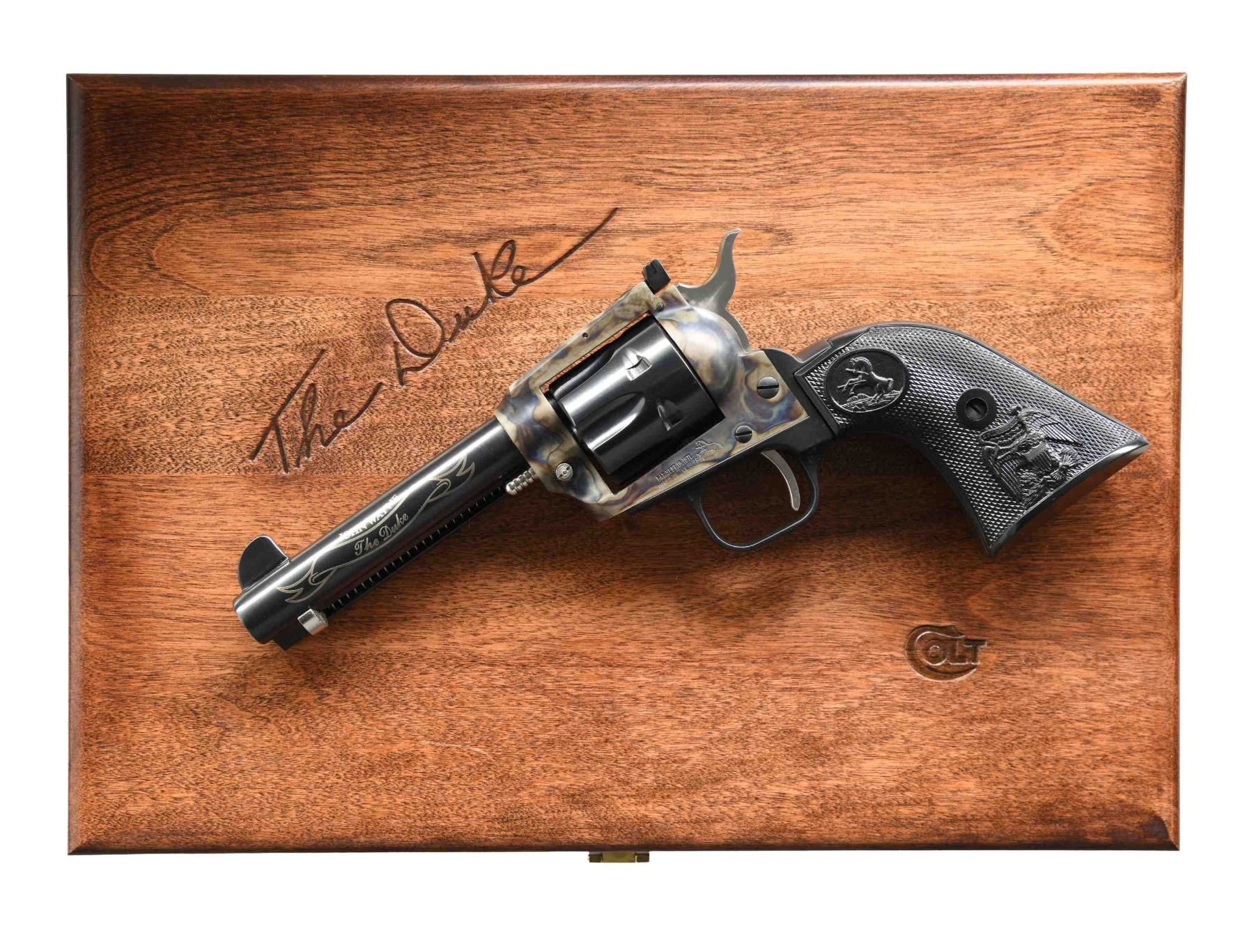 REVOLVER. Cal. 22 LR. S# G213957. Bbl. 4.4" with tall factory blade front sight and frame mounted Colt Accro adjustable rear sight. Mfg. 1984 (5,000 units) and serial numbered within regular production New Frontier .22 models; last of 61 commemorative 22 SAA's by Colt. Case hardened New Frontier .22 frame with nickeled trigger, hammer, base pin, base pin latch and ejector assembly; balance blued to include fluted cylinder. Silver banner etched on barrel with "The Duke" inside and "John Wayne" above. Checkered black plastic grips of SAA style having rampant Colt at tops plus American Eagle at bottoms. UNATTACHED ACCESSORIES: finely crafted Colt branded presentation case with "The Duke" on top. Red velvet interior having outlined base and rectangular plaque with Wayne's place and date of birth. Near excellent case condition. Colt florescent orange warning hang tag. CONDITION: all aspects near excellent appearing new and unfired. (24-4824/NW). CURIO. $500-750.