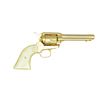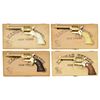 ALL 4: Cals. 22 LR. Barrels are 4 3/4" with blade front sights plus frame notched rears. Gold plated with slight differences in trim finishes and grips (all with gold Colt medallions); noted individually below. Commemorative barrel dates vary (1964-1966) as do dates of production (1965-1967) listed in reference books; noted below. All have light scroll engraving on butts. Cylinders are mixture of fluted and unfluted; noted below. Only 500 of each were manufactured; 2 are low 2 digit numbers (28). Silver fill in commemorative barrel lettering. UNATTACHED ACCESSORIES: Colt branded light colored wooden presentation cases with "Kansas Series", "Cow Towns" and with specific town below a Buffalo image. Interiors have outlined bases of velvet (or corduroy) with satin under lids having gold rampant Colt logo; colors and base material noted below. Possibly a faint mark on a case, but none noticed; 2 simple Colt cardboard protective sleeves for cases. Hairline crack on lid of Abiline case aligned with laminations. CONDITION: all aspects near excellent appearing new and unfired. 1). WICHITA. S# 260KW. Fluted cylinder, fully gold plated, 1964 barrel date (1965 by references), simulated pearl grips and red (corduroy base) case interior. (24-4792/NW). 2). ABILINE. S# 28KA. Fluted cylinder, fully gold plated, 1966 barrel date (1966 by references), smooth (gloss finished) dark walnut grips and royal blue (velvet base) case interior. (24-4796/NW). 3). DODGE CITY. S# 28KD. Unfluted cylinder, 1964 barrel date (1966 by references), simulated ivory grips and vivid green (velvet base) case interior. Blued frame accents to include: trigger, hammer, ejector rod head, base pin and action screws. (24-4797/NW). 4). COFFEYVILLE. S# 313KC. Unfluted cylinder, 1966 barrel date (1967 by references), smooth walnut grips and black (velvet base) case interior. Blued frame accents to include: trigger, hammer, ejector rod head, base pin and all screws except for ejector rod housing screw. (24-4800/NW). ALL CURIO. $2,000-2,750.