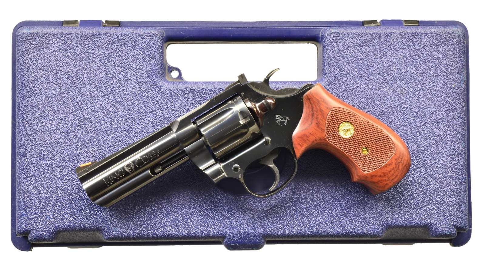 Cal. 357 Mag. S# VK9888. Bbl. 4" w/ orange insert sight blade (retained by 1 pin); white outlined Accro rear. Mfg. 1992 (1986-1992) w/ checkered wood grips having rnd. butt & gold Colt medallions. Wide grooved matte finished trigger & grooved hammer w/ tear drop shaped spur. UNATTACHED ACCESSORIES: Colt blue plastic case w/ paperwork but no model identifications. CONDITION: very light cyl. turn line & slight traces of firing residue; all other aspects near excellent including bore & grips. (22-53/NW). MODERN. $1,500-2,000.