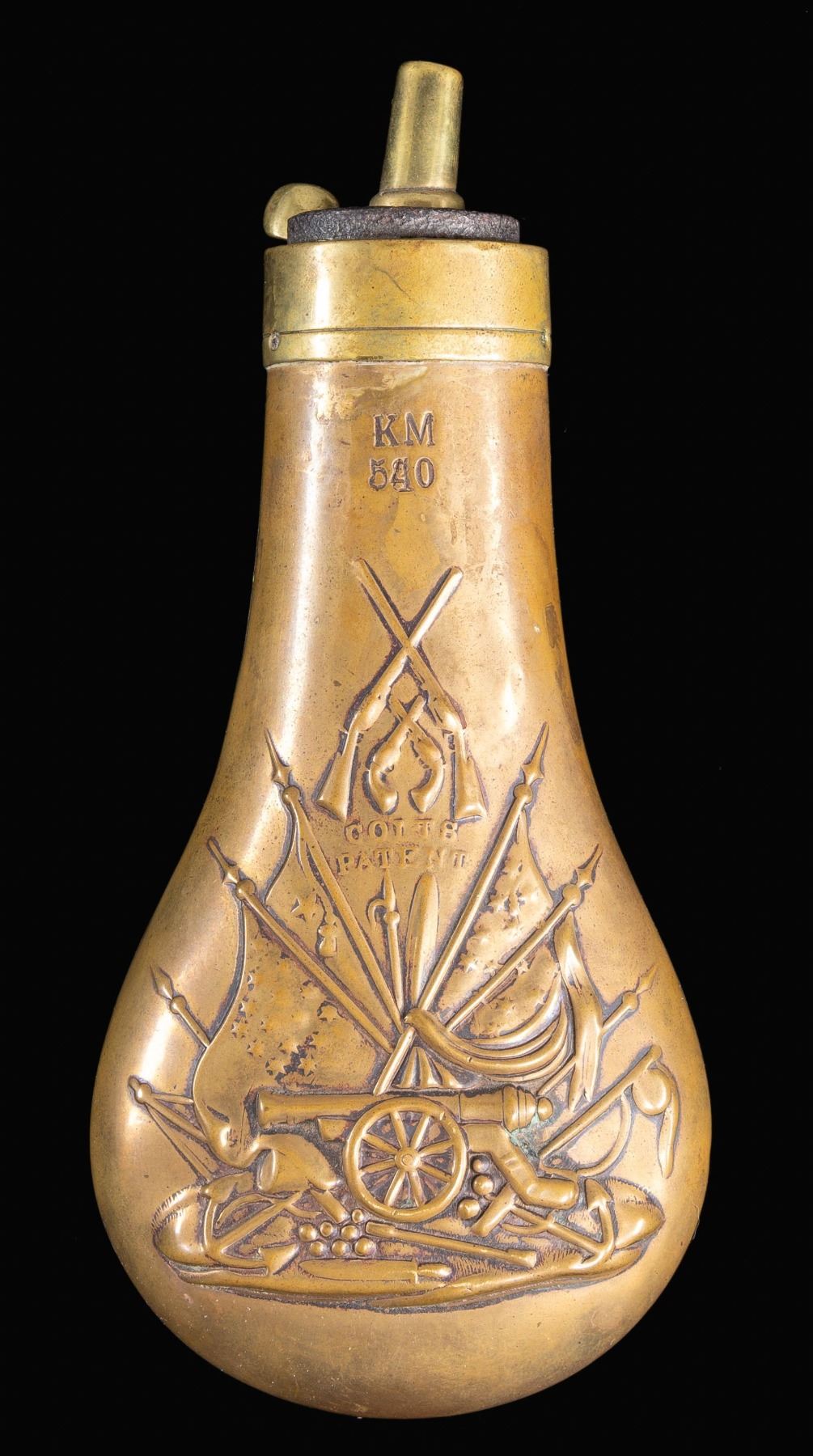 Made for 1851 navy revolver, standard "COLTS PATENT" panoply of arms flask, "KM / 580". CONDITION: good overall, cleaned, pitted spring. PROVENANCE: The Esteemed Norm Greenberg Collection. (02-24848-2/JS). NON-GUN. $600-800.