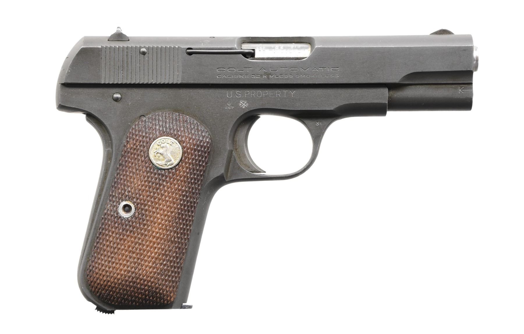 AUTO. Cal. 32 ACP. S# 565359. Bbl. 3 3/4". Breech end of bbl., slide & right side of frame have British proof markings. Frame is marked "U.S. PROPERTY". Blade front sight w/ square notch rear sight. 2 piece checkered walnut grips w/ silver rampant colt medallions. MAGS: 1 detachable 8 rd. UNATTACHED ACCESSORIES: 2 piece reproduction box. CONDITION: over 98% arsenal reparkerized finish. Grips show light wear. Bore retains lightly worn rifling. PROVENANCE: From the Collection of a Tennessee Gentleman. (24-4542/DS). CURIO. $1,500-2,500.
