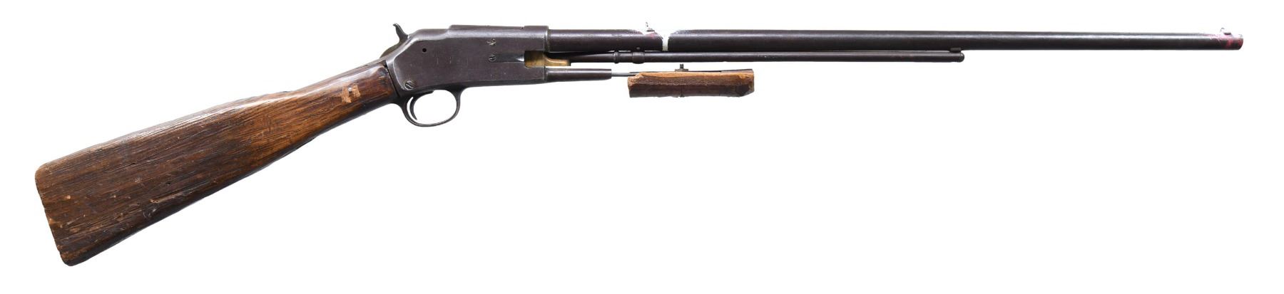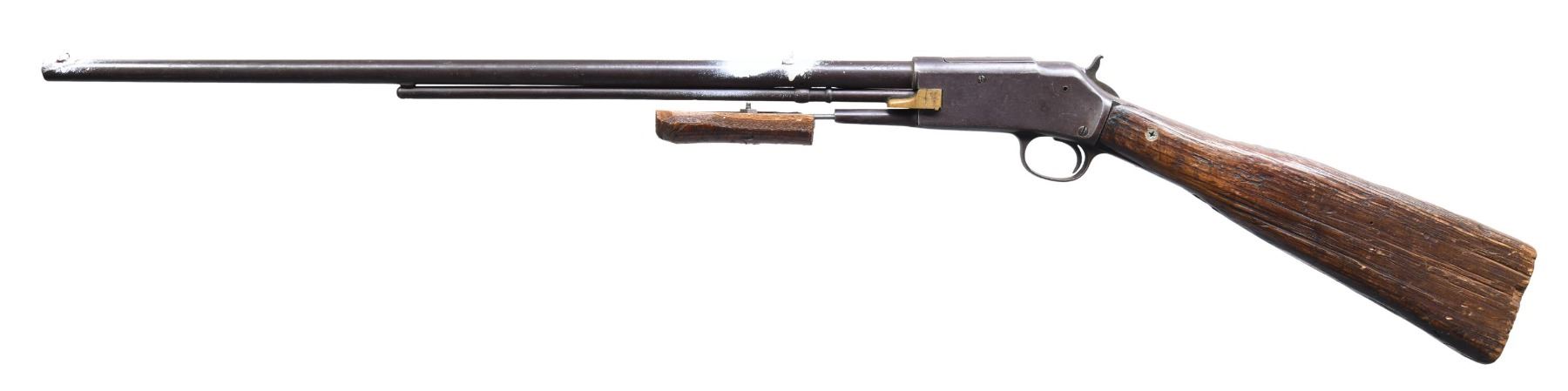 RIFLE. Cal. 22 S or L. S# 81571 (1903). Bbl. 24". Sporting sights. Replacement hobbyist-made pine forearm and buttstock. CONDITION: The balance of metal has a brown patina that shows pitting, with white and red paint over the sights. Poor wood finish. Two top tang screws and one action screw are missing. Bore shows pitting and rifling. The brass mag. tube retainer is loose and held in place by string. (24-7151/MD). CURIO. $200-300.