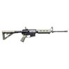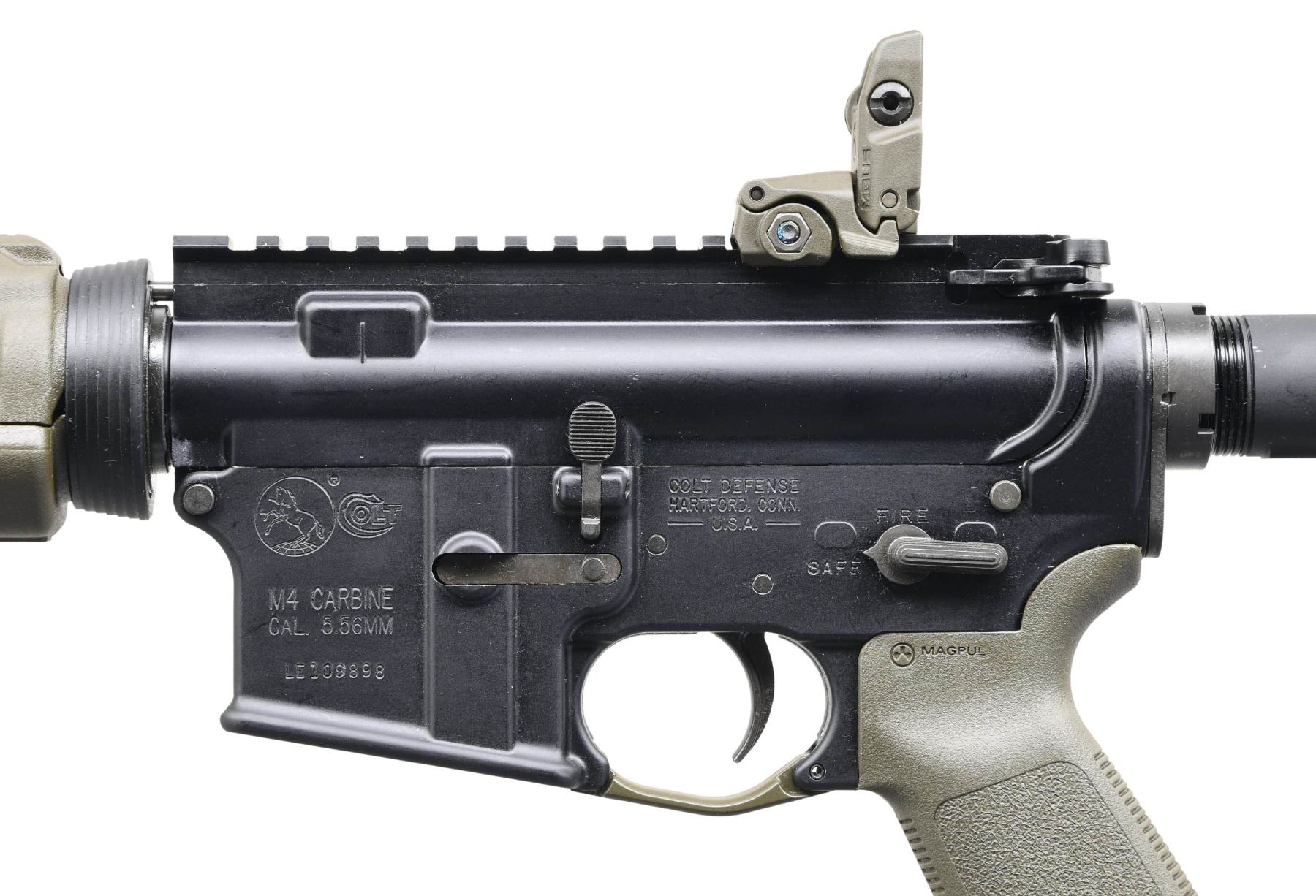 Cal. 5.56mm. S# LE109898. Bbl. 16". Colt's latest version of the time-honored M4 Carbine. 16" M4 profile barrel with threaded muzzle, currently sporting an A2 flash hider. Protected post front sight, gas block, bayonet lug, and sling swivel. 7" OD Green MagPul handguards retained with tapered delta ring. Flat top upper receiver with round forward assist and brass deflector. Currently sporting a green MBUS folding rear peep sight. Four-position MagPul OD Green collapsible shoulder stock. Matching green Magpul pistol grip w/ trap door. Left side is marked "COLT / M4 CARBINE / CAL. 5.56 MM" with the serial number on the mag well and "COLT DEFENSE / HARTFORD, CONN / USA" above the trigger. CONDITION: all aspects indicate very little use, if any. No noticeable finish blemishing aside from possibly something mounted on front section of rail thinning sharp edge finish under close inspection. No brass strike marks on deflector, which happens almost immediately. Bright bore with strong rifling. (24-2262/JZ). MODERN. $800-1,200.