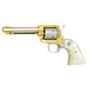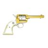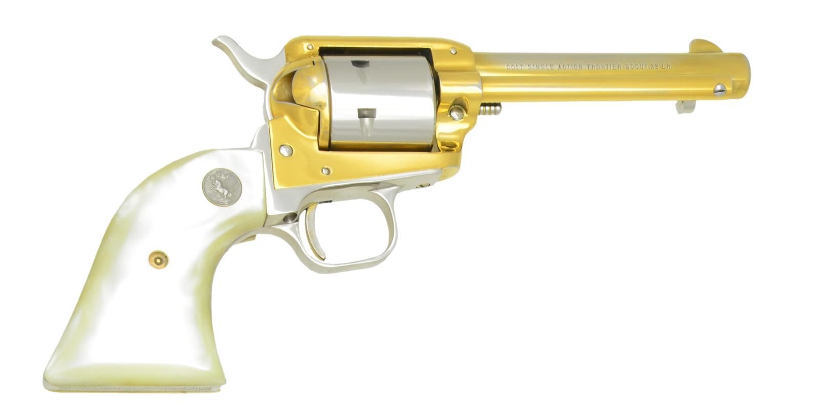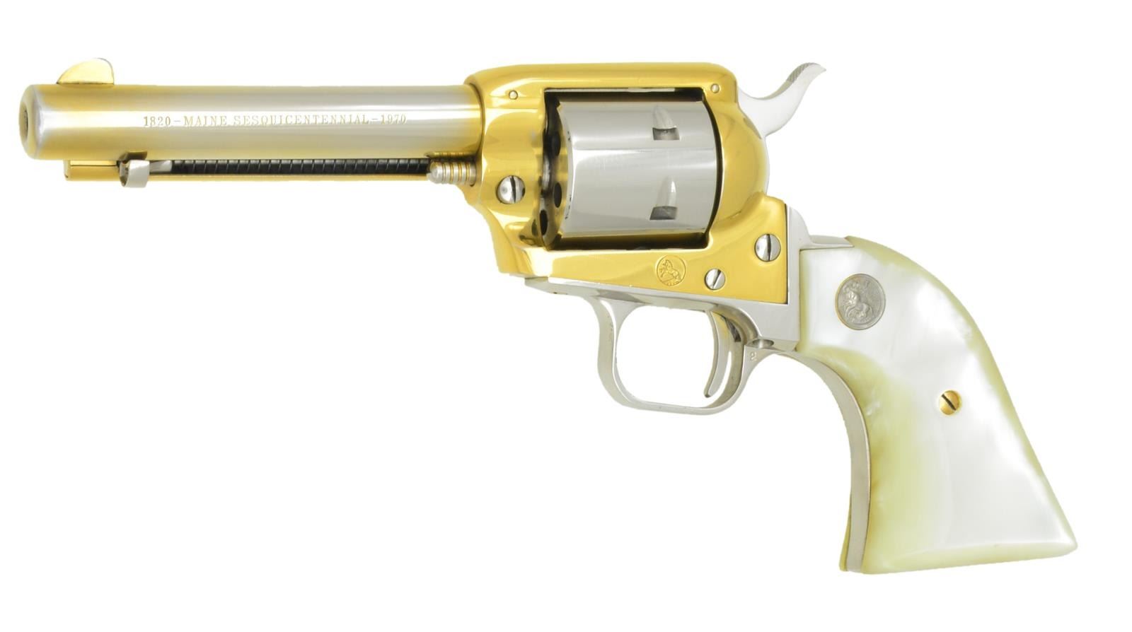 Cal. 22 LR. S# 1418MES. Bbl. 4 3/4" w/ blade front sight plus "1820 - MAINE SESQUICENTENNIAL - 1970" on left side & Colt Scout markings on right. Mfg. 1970 to commemorate Maine's 150th year of statehood; 3,000 units. Gold plated frame, bbl., ejector housing & trigger. Nickel plated grip frame, hammer & unfluted cyl.; corresponding screw plating throughout. Simulated pearl grips w/ silver Colt medallions; light scroll work on butt of grip frame. UNATTACHED ACCESSORIES: good commemorative marked display box of Maine pine w/ blue velvet shadow lined base plus removable lid having gold accents & sesquicentennial markings on blue satin. Patina & handling marks on case exterior having commemorative markings on lid. In keeping w/ Maine tradition, Colt marked gold plated decorative lobster sits in recess of case base. CONDITION: very good plus appearance w/ gold plating on trigger & left side of bbl. worn to base nickel plating. Light traces of firing residue in action. Bore, grips & balance of revolver is near excellent. (22-5714/NW). CURIO. $450-600.