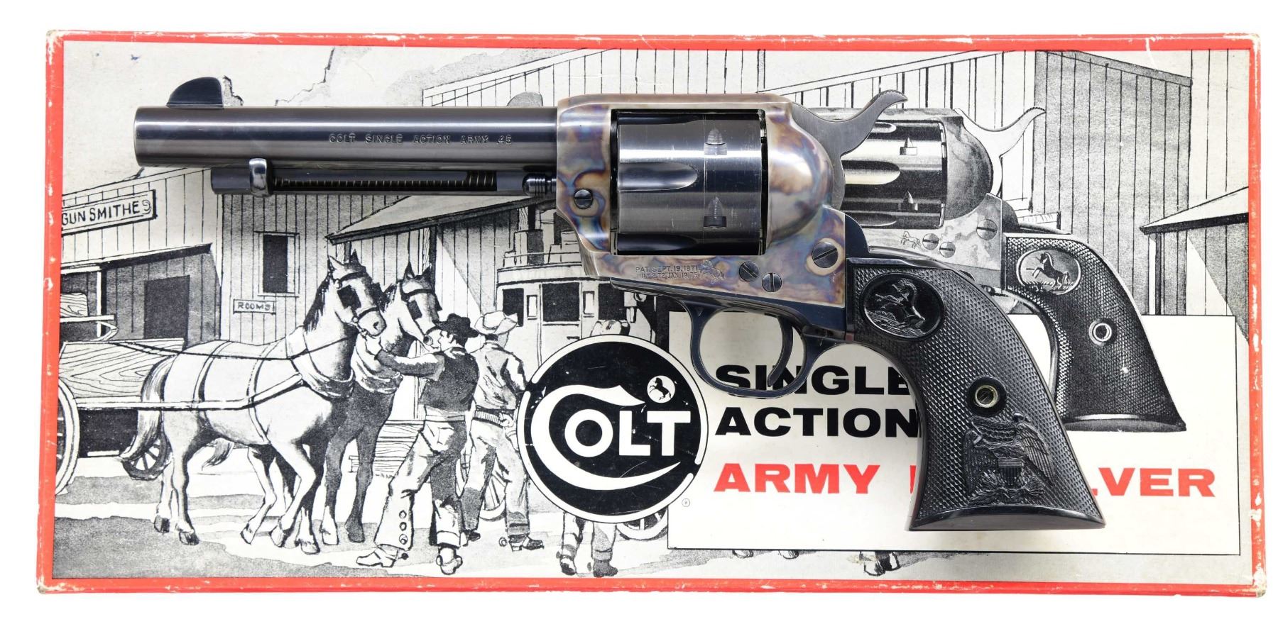 Cal. 45 Colt. S# 52610 SA. Bbl. 5 1/2". Six-shot fluted cyl. Blue and case-colored finish. Two-piece checkered plastic eagle grips. Mfg. 1970. UNATTACHED ACCESSORIES: two-piece unnumbered stagecoach box with proper label; box contains instructions and warranty card. CONDITION: over 97% finish, showing slight edge wear with cyl. drag line. Very good grips. Bright, near excellent bore. (24-4831/DS). CURIO. $2,000-2,750.