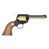 REVOLVER. Cal. 22 LR. S# 578MOS. Bbl. 4 3/4" Mfg. 1970 in celebration of Missouri's Sesquicentennial; 3,000 units. Blued finish with gold plated fluted cylinder, loading gate, ejector housing, ejector rod head, trigger, hammer plus screws for ejector housing and trigger pivot. Smooth walnut grips with gold Colt medallions and grip screw plus light scroll engraving on butt. Dates on barrel of 1820 and 1970 along with commemorative markings (all gold filled). Maine entered the union in 1820 as a free state under the Missouri Compromise with Missouri as a slave state. UNATTACHED ACCESSORIES: most distinctive Colt branded display case allowing viewing of the revolver from the front or top. Removable top plate allows for locking; base has outline for enclosed gold commemorative coin. Interior base and back are dark red velvet with balance of wood construction. Top and front viewing plates have commemorative info. Brass hook on back case panel engages chamber section at front of cylinder for invisible retention; near excellent case set. CONDITION: all aspects near excellent appearing new and unfired. (24-4819/NW). CURIO. $500-750.