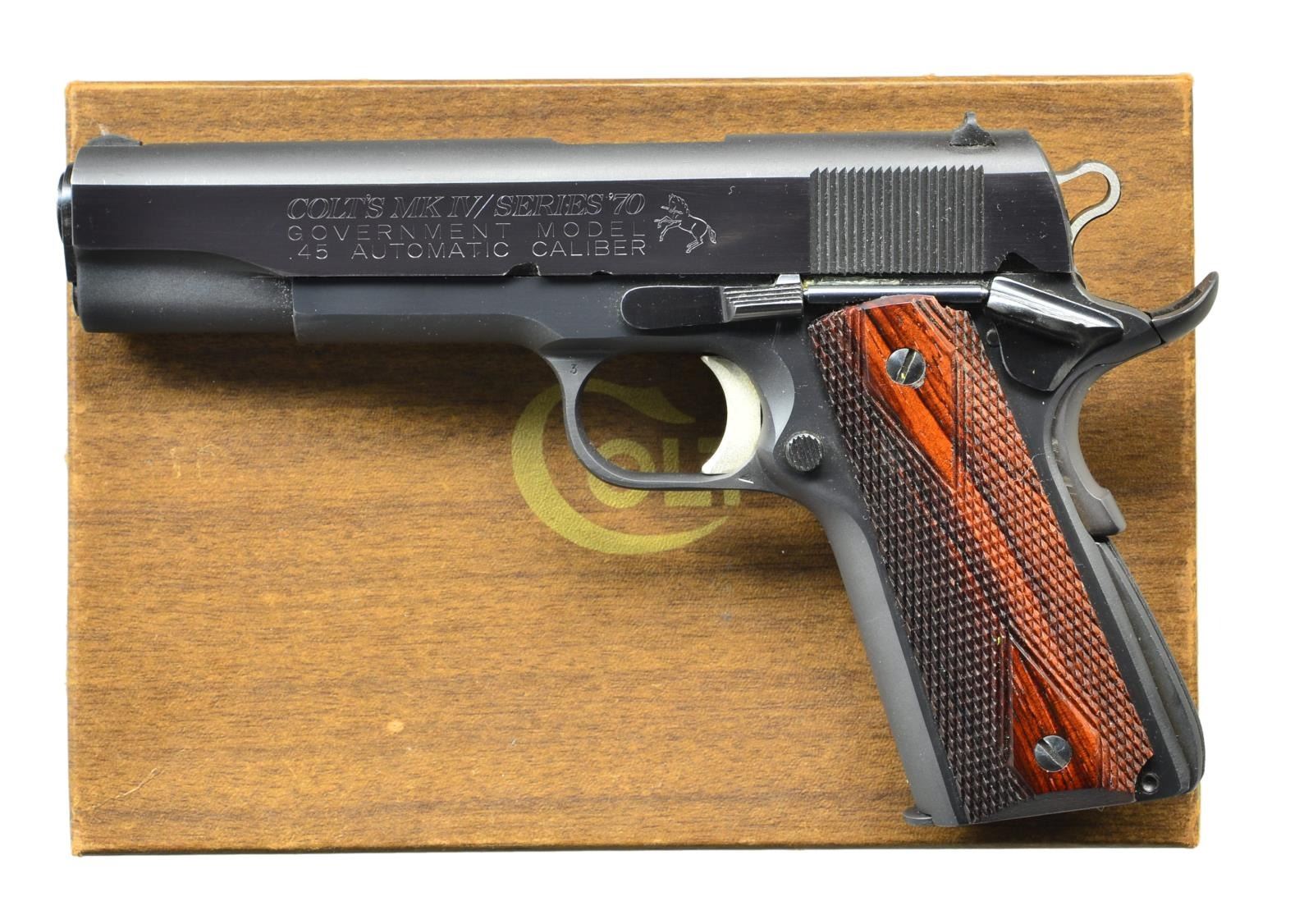 Cal. 45 ACP. S# 70G06825. Bbl. 5". Mfg. 1971. Dark blue finish on exposed metal surfaces. Serrated rounded top slide marked "COLT'S MKIV / SERIES 70 / GOVERNMENT MODEL / 45 AUTOMATIC / CALIBER" w/ horse logo & right side marked "COLT'S GOVERNMENT MODEL". Serrated front blade & drift adj. rear sight. Skeletonized serrated hammer. Extended beavertail grip safety & serrated arched mainspring housing. Smooth front strap. Double diamond checkered hardwood grips. Bbl. marked "COLT 45 AUTO / MK. IV / SERIES 70". MAGS: 1 Colt 7 rd. UNATTACHED ACCESSORIES: original numbered box. Original checkered grips w/ gold Colt medallions & spare parts appearing to be original hammer & beavertail grip safety. CONDITION: original finish enjoys complete & consistent coverage w/ extremely gentle thinning in areas of mechanical intervention plus high spots around muzzle. All grips appear free of any noticeable blemishing. Bright bore w/ sharp rifling. Fire control mechanism appears to function correctly when cycled by hand. (22-1807/JZ). CURIO. $900-1,400.