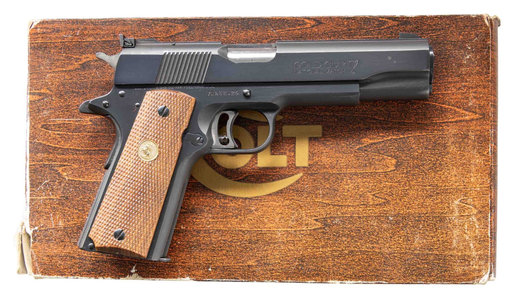 PISTOL WITH BOX. Cal. 45 ACP. S# 70N62025. Bbl. 5". Mfg. 1979. Patridge front sight & Elliason adjustable rear. Grooved skeletonized trigger & front strap. 2 Piece checkered walnut grips with Rampant Colt medallions. UNATTACHED ACCESSORIES: original wood grain Colt box with styrofoam inserts and paperwork. CONDITION: metal retains 97% original blue with 2 small spots of cleaned pinprick oxidation on right side of slide & 1 on left of slide. Very good grips; right panel has 1 flaked spot of finish missing at bottom. Mirror bore with crisp rifling. PROVENANCE: From the Buckstix Collection. (25-6340/BH). MODERN. $1,200-1,600.