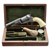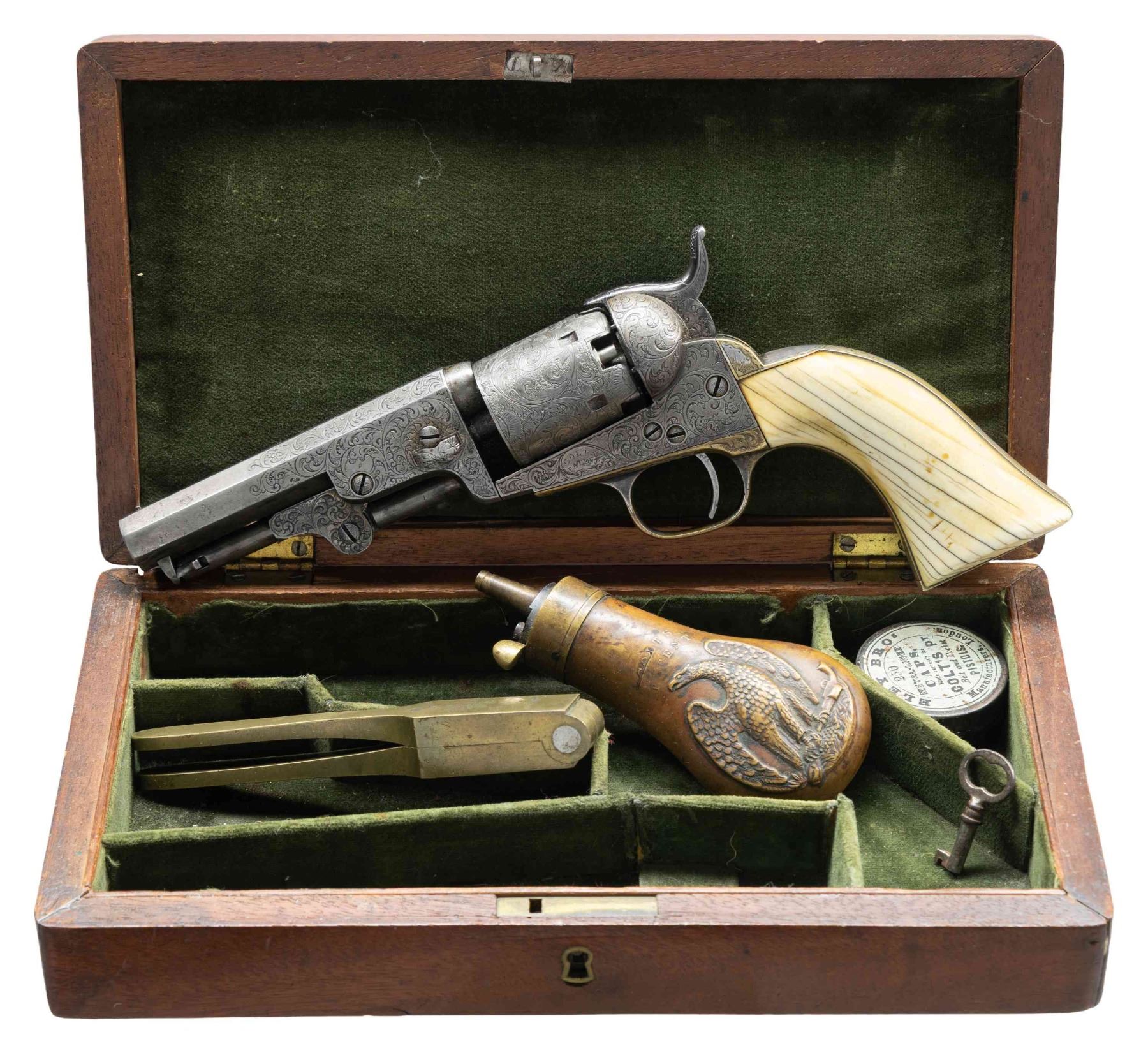 ENGRAVED CAP & BALL REVOLVER WITH CASE. Cal. 31. S# 97331. Bbl. 4" octagon bbl. with brass bead. Top flat is engraved "Sam Colt". 6-shot rnd. cyl. Left side of frame is engraved "COLT'S/ PATENT". Frame has full coverage foliate scroll engraving with punch dot backgrounds. Bbl., grip straps, and loading lever have over 50% coverage matching engraving. Cyl. has complimentary engraving done by a different hand at a later time that runs across the top of the S#. Original finish was blue and case colored with silver finished brass back strap and small brass trigger guard. 1-piece ivory grip. Mfg. in 1854. UNATTACHED ACCESSORIES: wood casing with green velour fitted interior. Case contains small eagle flask marked "COLTS/ PATENT", 2-cavity brass mold, Eley Bro. cap tin, and case key. Case exterior has lightly worn finish showing scattered scratches, marks, and small dents. Case interior shows moderate wear. CONDITION: bbl. and receiver finish have a natural gray faded appearance showing small dents and spots of very light pitting. Cyl. has a brighter appearance with engraving having a fresher unworn look. Brass grip straps retain over 30% silver. Grip shows age related yellowing and checking. Cyl. does not rotate properly when action is cycled. Pitted bore retains intact rifling. PROVENANCE: Estate Collection of Nicholas Apergis. (01-27446/DS). ANTIQUE. $4,000-6,000.