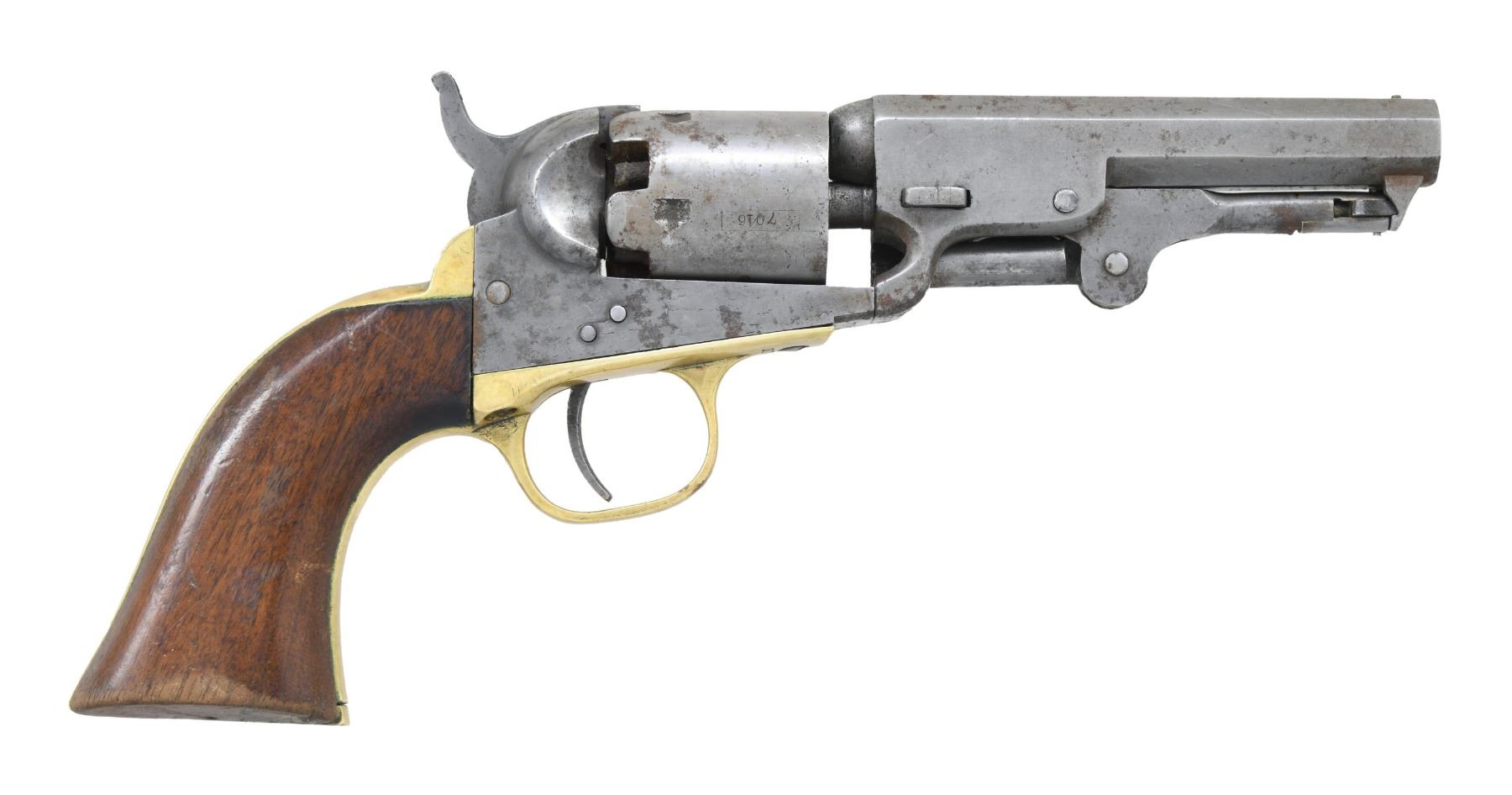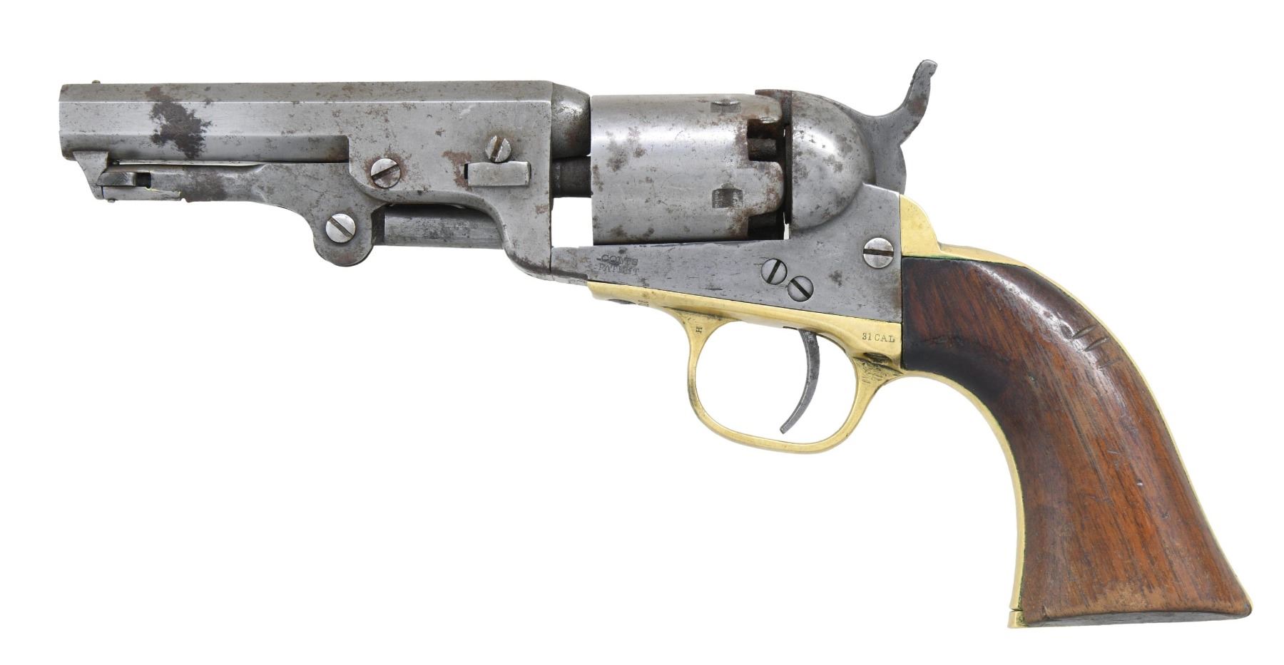 REVOLVER. Cal. 31. S# 277046. Bbl. 4". Model 1849 Pocket single action percussion revolver mfg. by Colt in 1865. Top flat of the octagonal bbl. is marked with Colt's New York address. Left side of the frame is marked "COLT'S PATENT", with "31 CAL" marked on the left side of the trigger guard. Steel frame, cyl., bbl., loading lever, trigger, and hammer have been cleaned at one time. Brass trigger guard and grip strap have been cleaned, and are fitted with a 1-piece smooth wood grip. All serialized parts are matching and include the frame, cyl., cyl. base pin, bbl. wedge, bbl., trigger guard, as well as the rear grip strap. Cyl. has possibly been renumbered at one time to match, with the majority of the cyl. scene no longer being present. CONDITION: metal components exhibit a gray patina, with scattered areas of mild to moderate oxidation present overall. Brass trigger guard and rear grip strap are bright, as previously cleaned. Dark pitted bore, retaining good rifling throughout. Grip shows some wear, some superficial handling marks, as well as 3 notches on the left side. (01-26216/MLW). ANTIQUE. $700-900.
