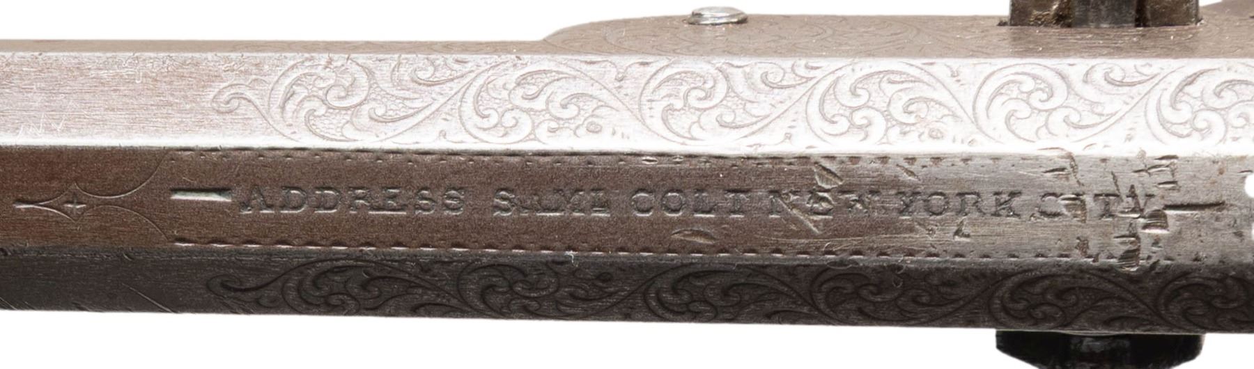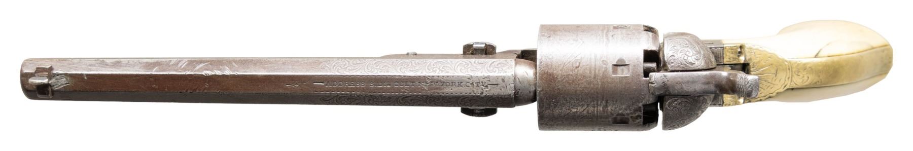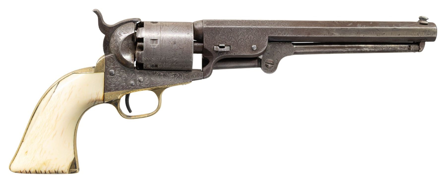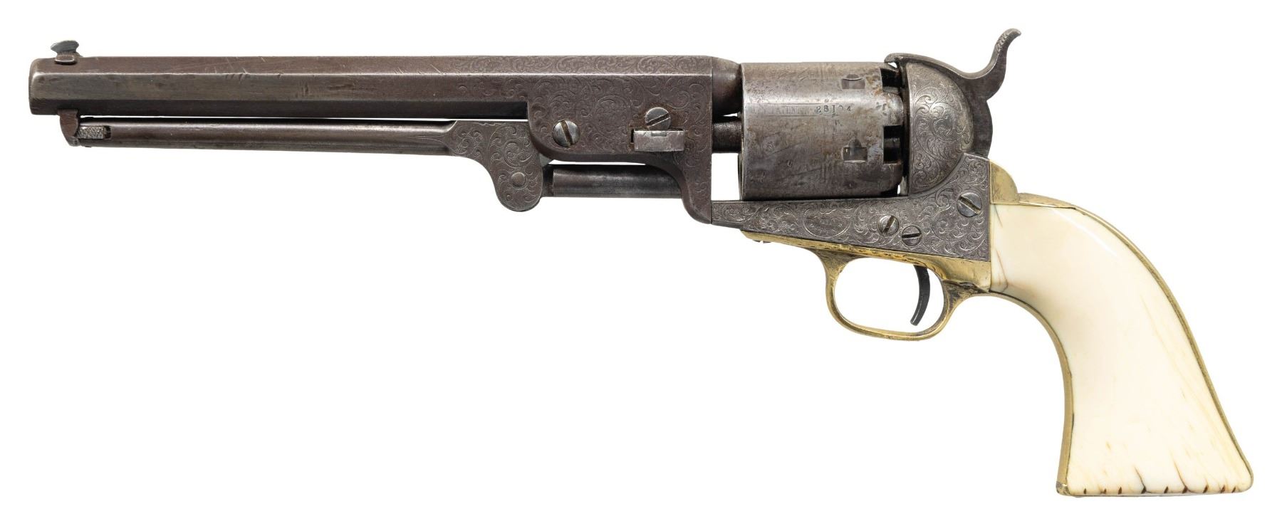 Cal. .36. S# 28194. Standard configuration Colt model 1851 navy revolver, 7.5” octagonal barrel with one-line New York City address. Frame is hand engraved in reverse arc “COLTS PATENT” by Gustav Young shop during his heyday at Colt in 1853, full coverage engraving incorporates foliate scrolls terminating in petalled flower serpent’s head on either side of barrel housing. S#s are accompanied by a small punch dot which indicated extra polish for engraving. Original factory 1-piece smooth ivory grips. CONDITION: good to very good overall, all matching and complete other than unserialized wedge. This revolver is well worn from long honest use, front sight was replaced with inset dovetailed blade, grips have large chip on right inside toe. Mechanics need attention, cocks fine, cylinder does not advance every time. Good rifled bore. (01-28698/JS). ANTIQUE. $4,000-6,000.