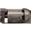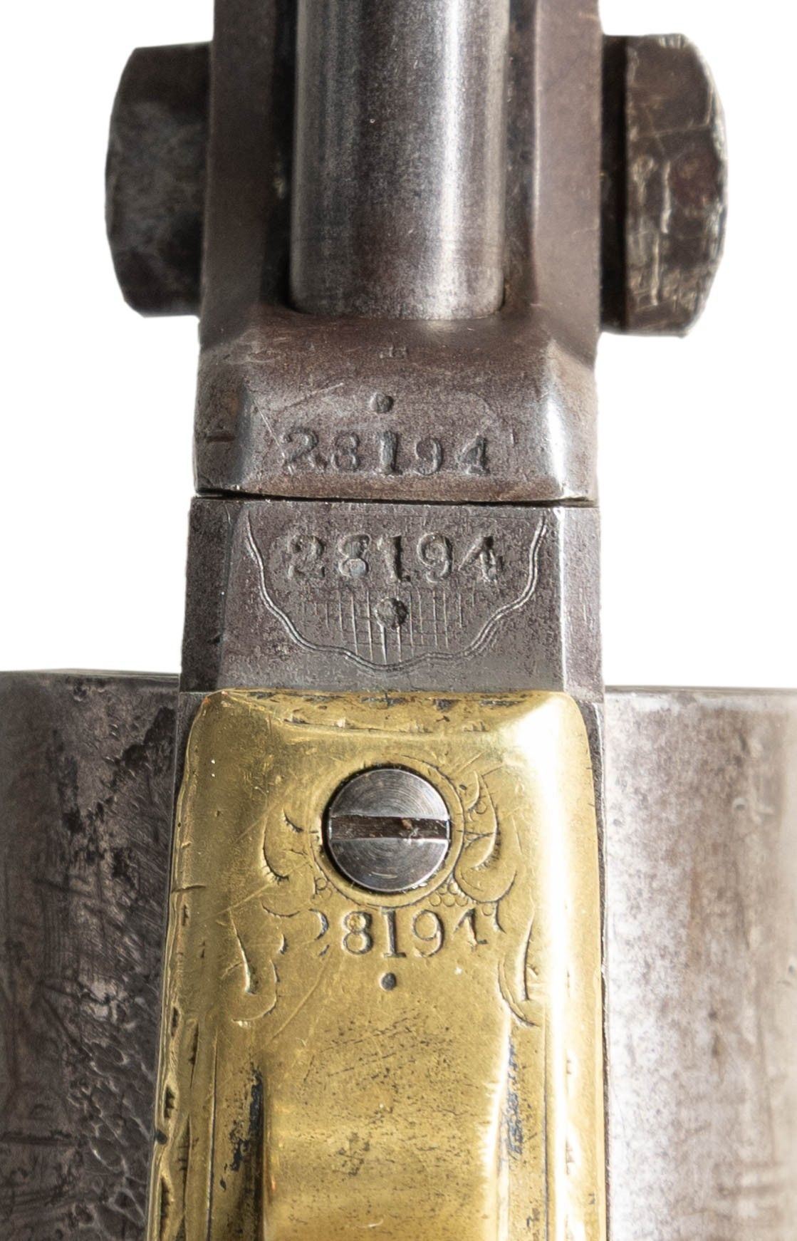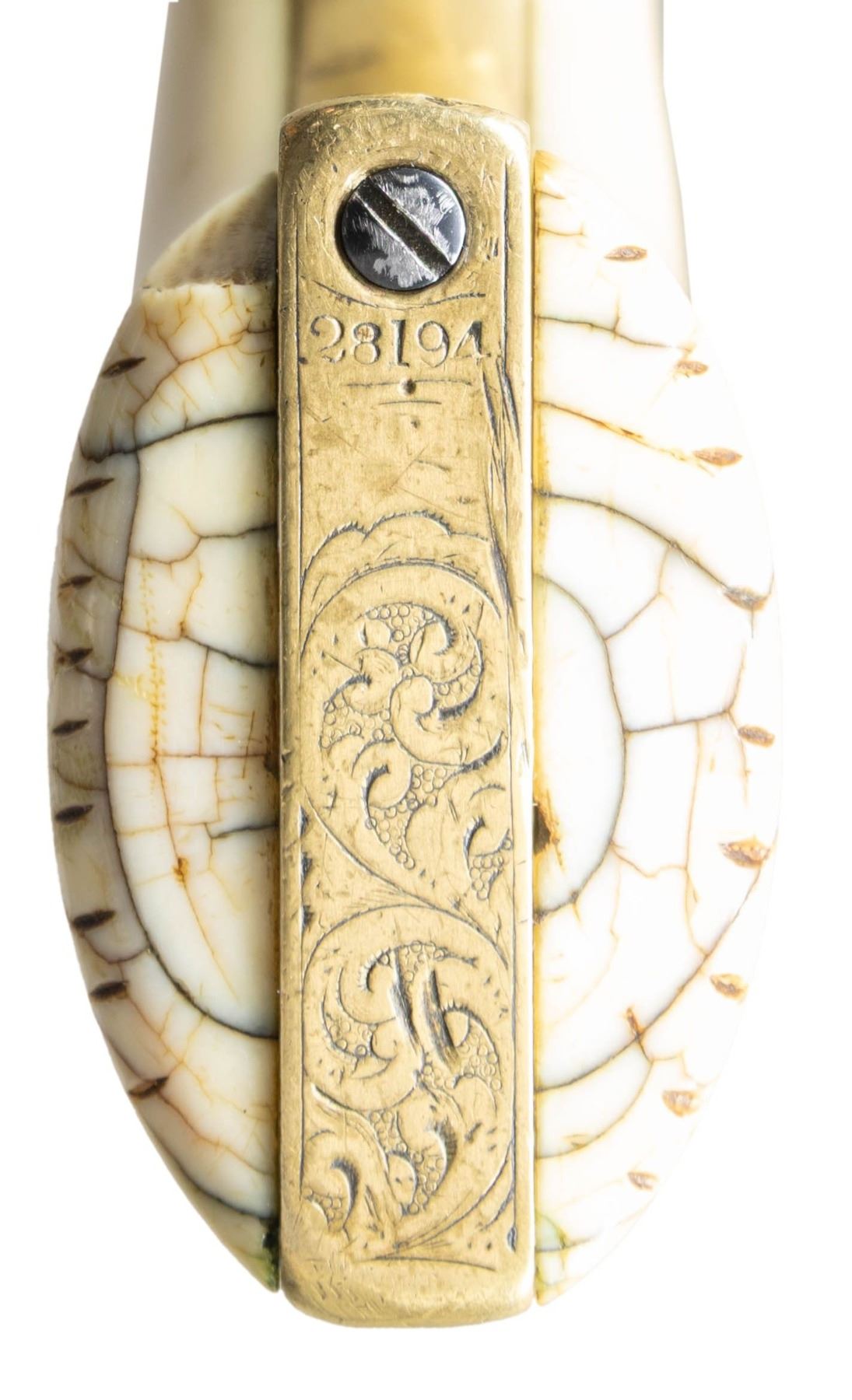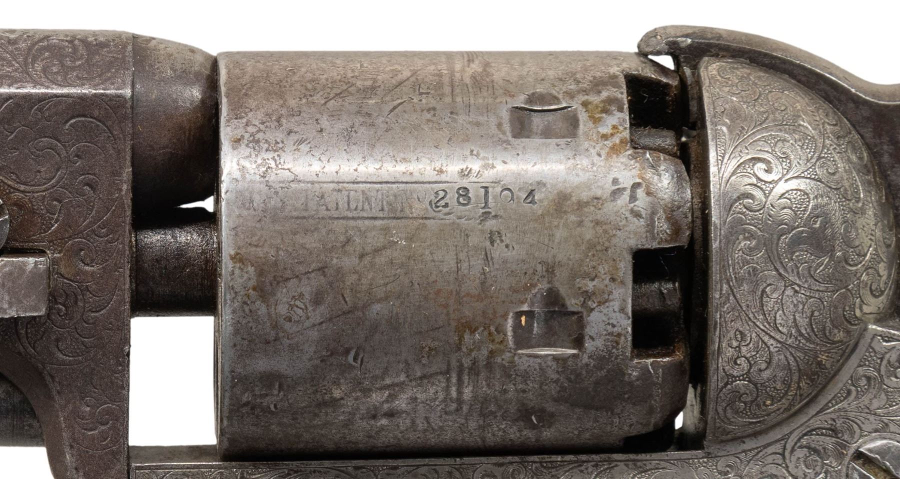 Cal. .36. S# 28194. Standard configuration Colt model 1851 navy revolver, 7.5” octagonal barrel with one-line New York City address. Frame is hand engraved in reverse arc “COLTS PATENT” by Gustav Young shop during his heyday at Colt in 1853, full coverage engraving incorporates foliate scrolls terminating in petalled flower serpent’s head on either side of barrel housing. S#s are accompanied by a small punch dot which indicated extra polish for engraving. Original factory 1-piece smooth ivory grips. CONDITION: good to very good overall, all matching and complete other than unserialized wedge. This revolver is well worn from long honest use, front sight was replaced with inset dovetailed blade, grips have large chip on right inside toe. Mechanics need attention, cocks fine, cylinder does not advance every time. Good rifled bore. (01-28698/JS). ANTIQUE. $4,000-6,000.