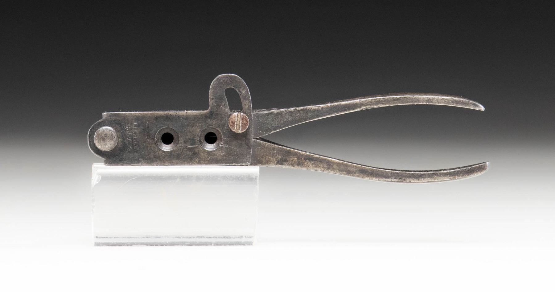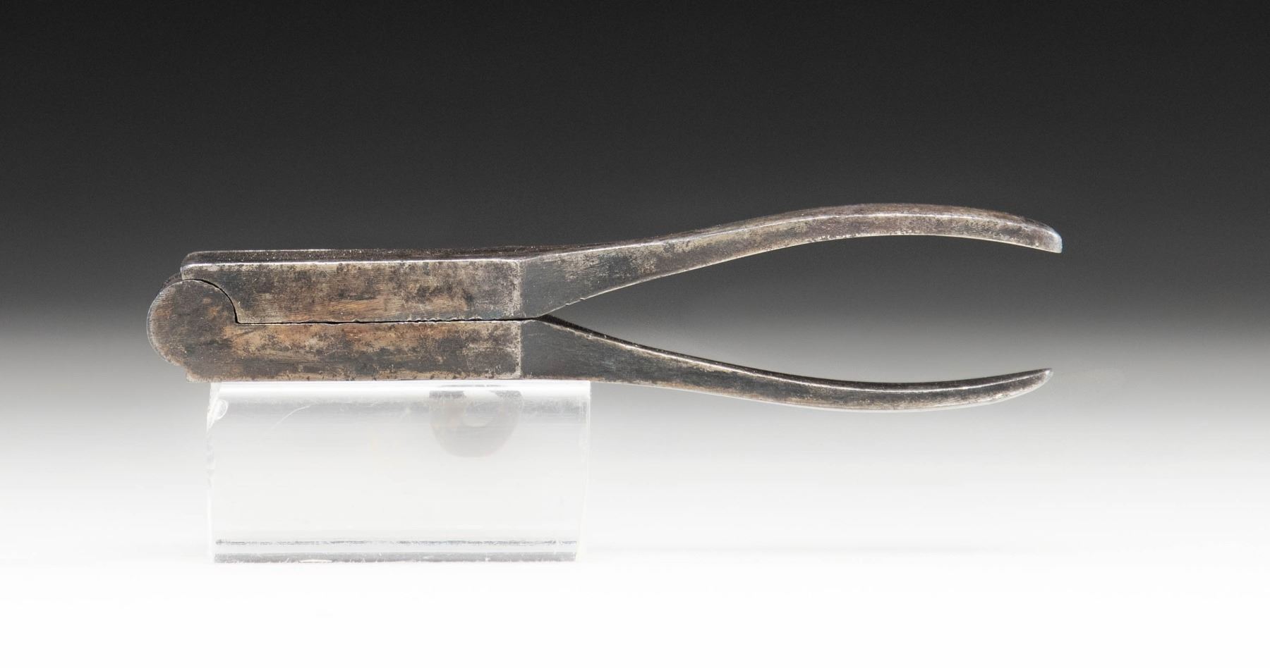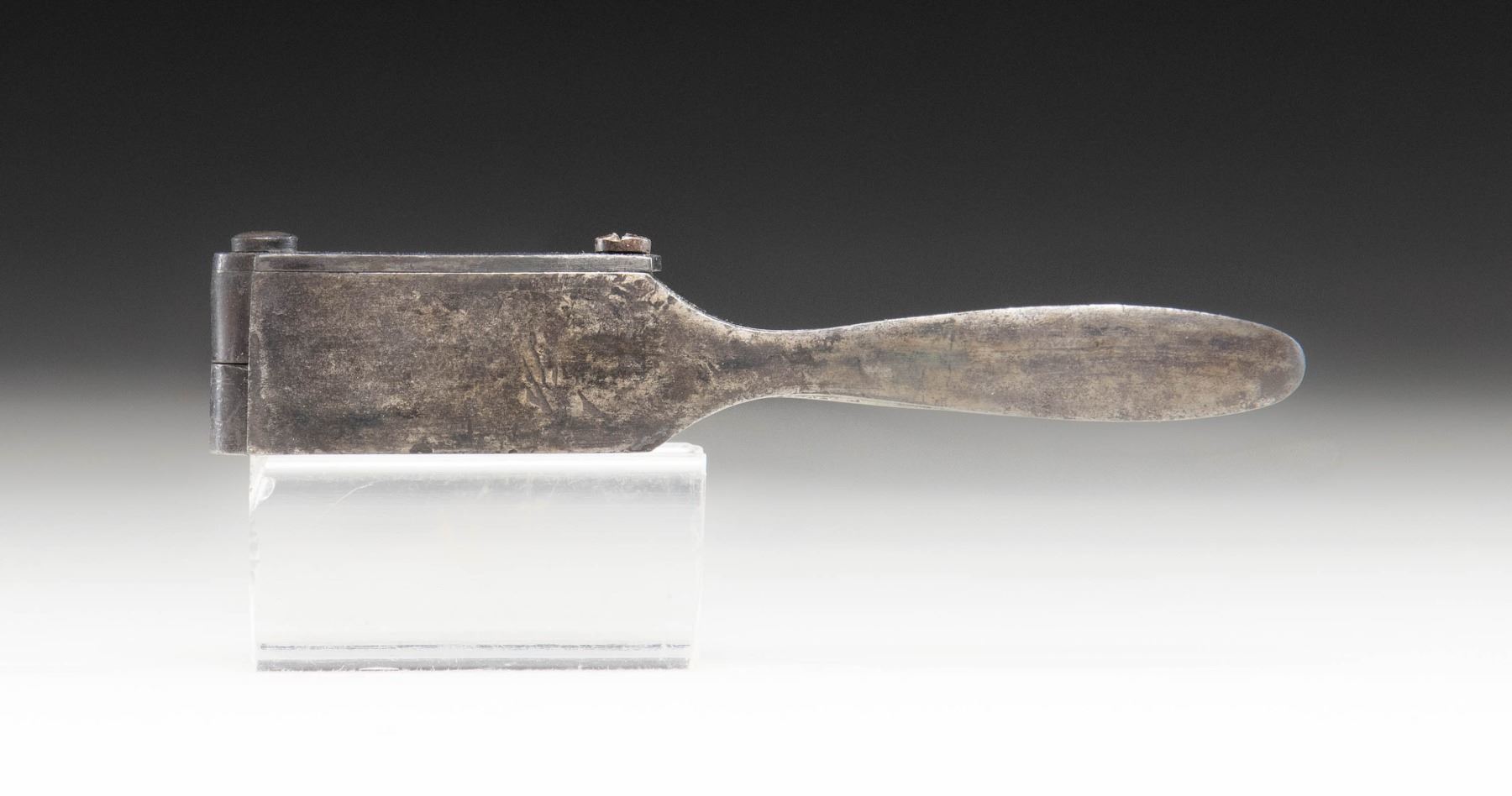 MOLD. .44 caliber dual cavity bullet (1 for conical ammunition, 1 for rnd. ball ammunition) mold mfg. by Colt for use with the Model 1860 Army. Sprue cutter is marked "COLT'S/ PATENT" towards the hinge. Right side of mold is marked "44H". Iron construction with blued finish. CONDITION: mold retains fair amounts of its original blue finish, with the balance exhibiting wear and thinning that has faded to gray patina, scattered impressions, as well as spots/patches of light pitting. (02-25598/MLW). NON-GUN. $100-200.