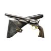 CONFEDERATE BELT, HOLSTER & ACCOUTREMENTS. Cal. 44. S# 4965. Bbl. 8". Standard configuration of the Colt 1860 army revolver, 4-screw frame made for shoulder stock, fluted cylinder with patent markings on one flute and S# on back, small "COLT’S / PATENT" left side of frame. One line New York address. Many fluted army revolvers were shipped South. UNATTACHED ACCESSORIES: Civil War era belt with original 2 piece "CS" buckle, Confederate cap box with lead finial, pistol cartridge box. Holster is military style, made from repurposed leather, unusual buckled belt loop. CONDITION: revolver is good, all matching except backstrap which is renumbered, several screws replaced, grips well fit & worn, metal dark iron patina, pitting. Mechanics are fine, good rifled bore. Leather is fair, dry, flaking, resewn seams & tabs, buckle has dark dirty patina. (01-22906/JS). ANTIQUE. $3,000-5,000.
