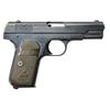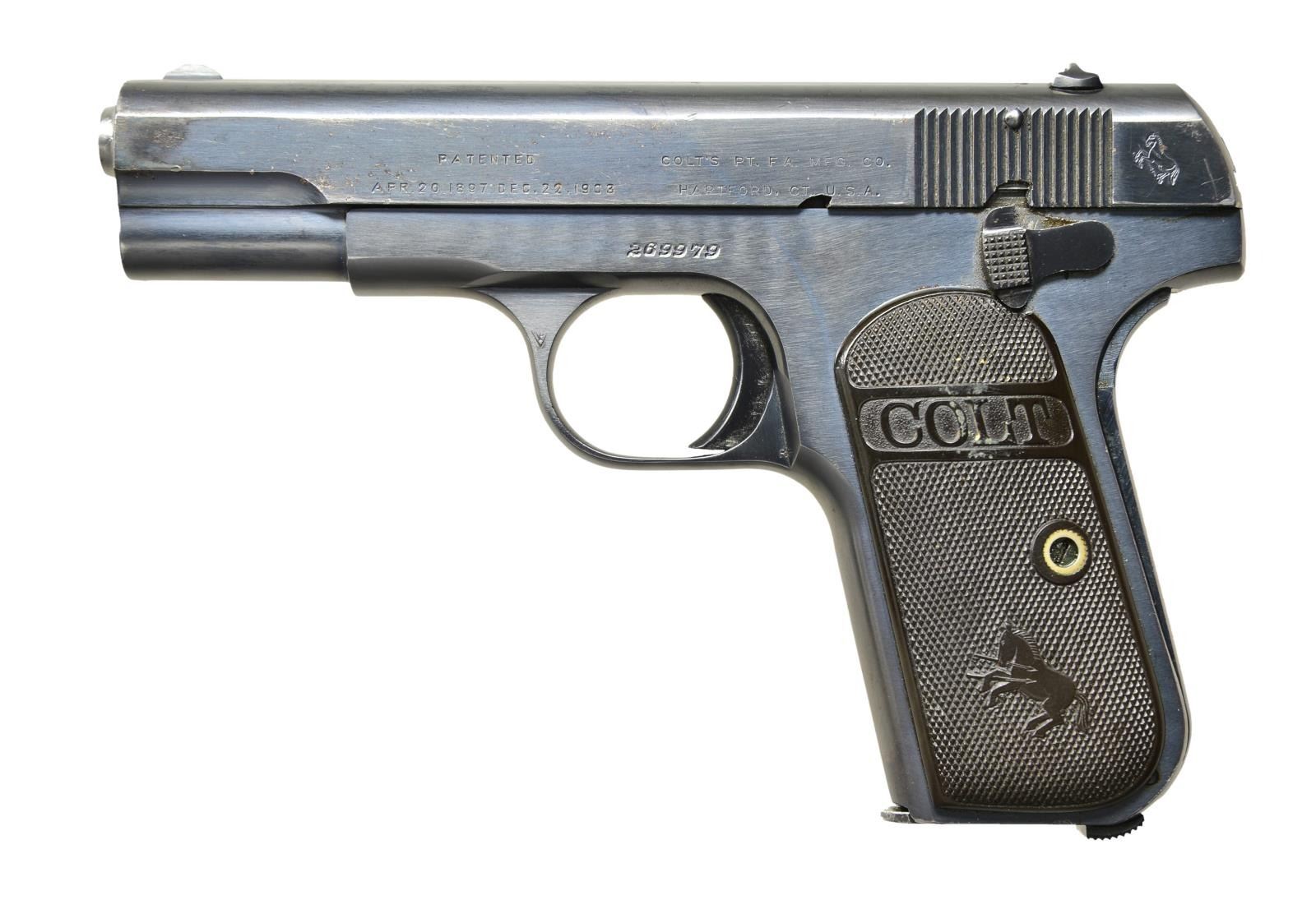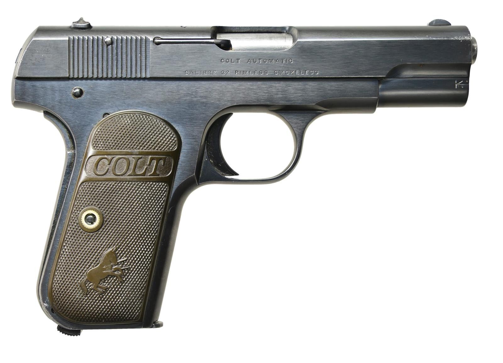 Cal. 32 ACP. S# 269979. Bbl.4". Mfg. 1903-1946. Hammerless design. Blued finish. Left side slide lock. Bottom mag release. Round blade front & drift adjustable notch rear sights. Serrated slide. Backstrap safety. 2 piece checkered rubber grips w/ Colt logo. MAGS: 1 steel 7rd magazine. CONDITION: Finish is complete & consistent w/ only minor thinning on left side along high spots. Bore is bright w/ strong rifling. (22-6052/JZ). CURIO. $500-700.