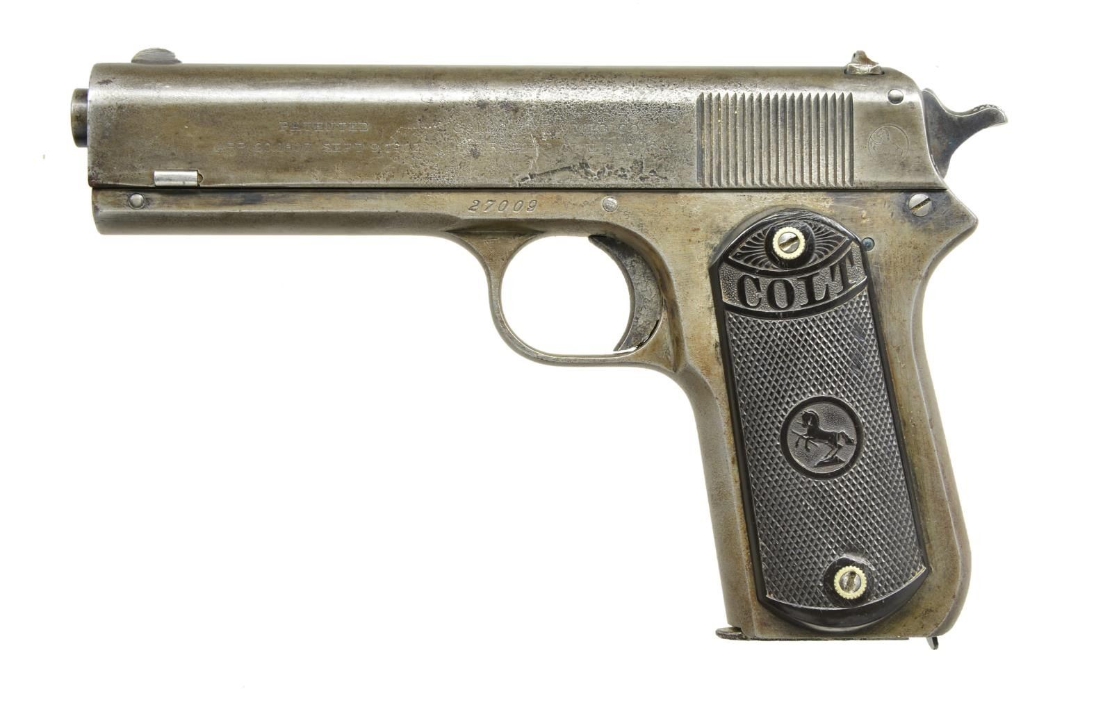 Cal. 38 Rimless (38 ACP). S# 27009. Bbl. 4 1/2"; hammer version. Mfg. 1911 (1903-1929) with "COLT" and Colt logo checkered hard rubber grips. MAGS: 1 fair factory nickel plated 7 rd.; minimal finish remaining. CONDITION: fair grey patina appearance with notable area of cleaned pitting about midpoint on left side of slide. Good to very good grips with light hand wear. Fair bore; worn with even light pitting. (22-6054/NW). CURIO. $450-650.