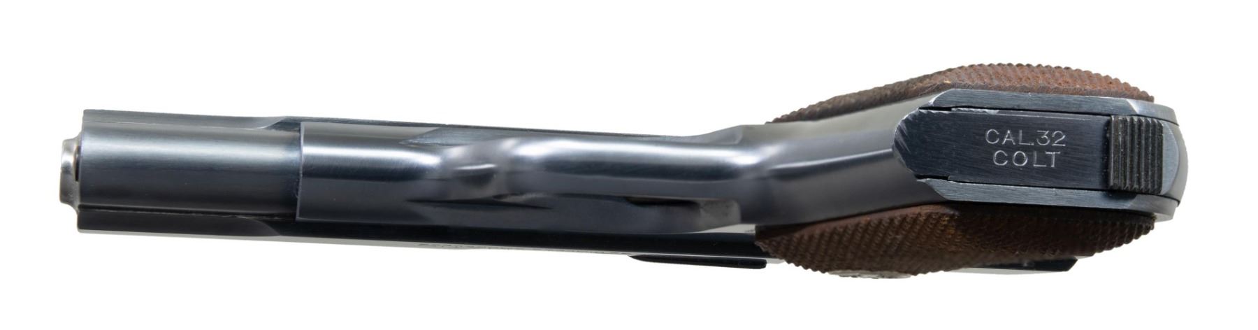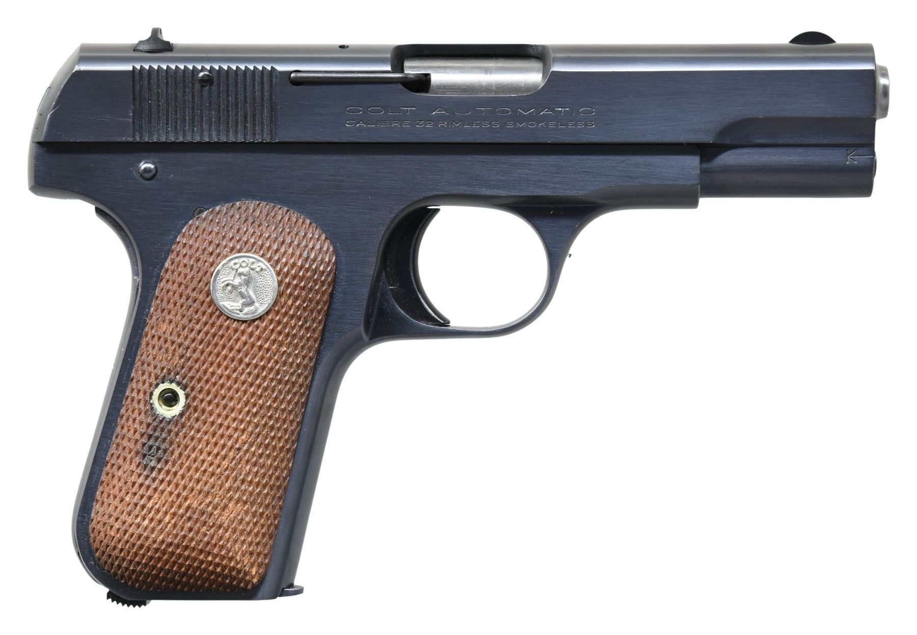 Cal. 32 ACP. S# 554839. Bbl. 3 3/4". Mfg. 1941 (1903-1946) as Type IV with magazine safety. Blued having fully checkered walnut grips with silver Colt medallions. Commercial model with appropriate marks on fronts of trigger guard (200,000 made for US Military with "M" prefix in serial number). MAGS: 1 near excellent all blue 8 rd. marked "CAL.32" over "COLT" on base. Correct for period having "flat top". CONDITION: exceptional collector quality example with unfired appearance. (25-3683/NW). CURIO. $750-1,000.