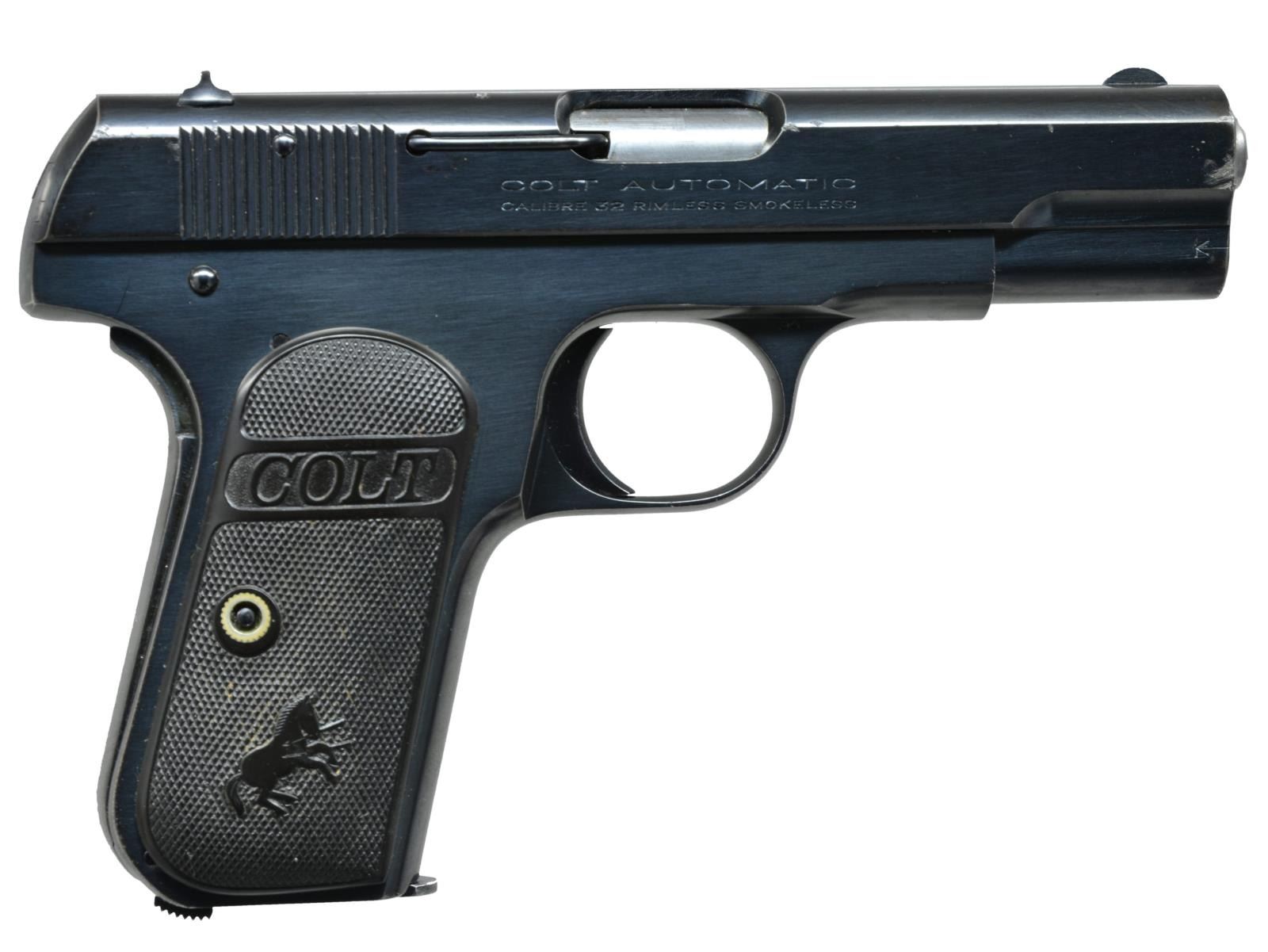 Cal. 32 ACP. S# 414682. Bbl. 3 3/4". Semi circular front sight w/ fixed U notch rear sight. Blue finish. 2 Piece checkered hard rubber Colt marked grips w/ Rampant Colt motifs. Mfg. 1922. MAGS: 1 two tone 8 rd. UNATTACHED ACCESSORIES: Protecta-gun box. CONDITION: over 85% blue showing light edge wear w/ scattered scratches, sm. dents & spots of corrosion. Bright bore retains strong rifling. Grips show light wear (21-985/DS). CURIO. $600-900.