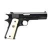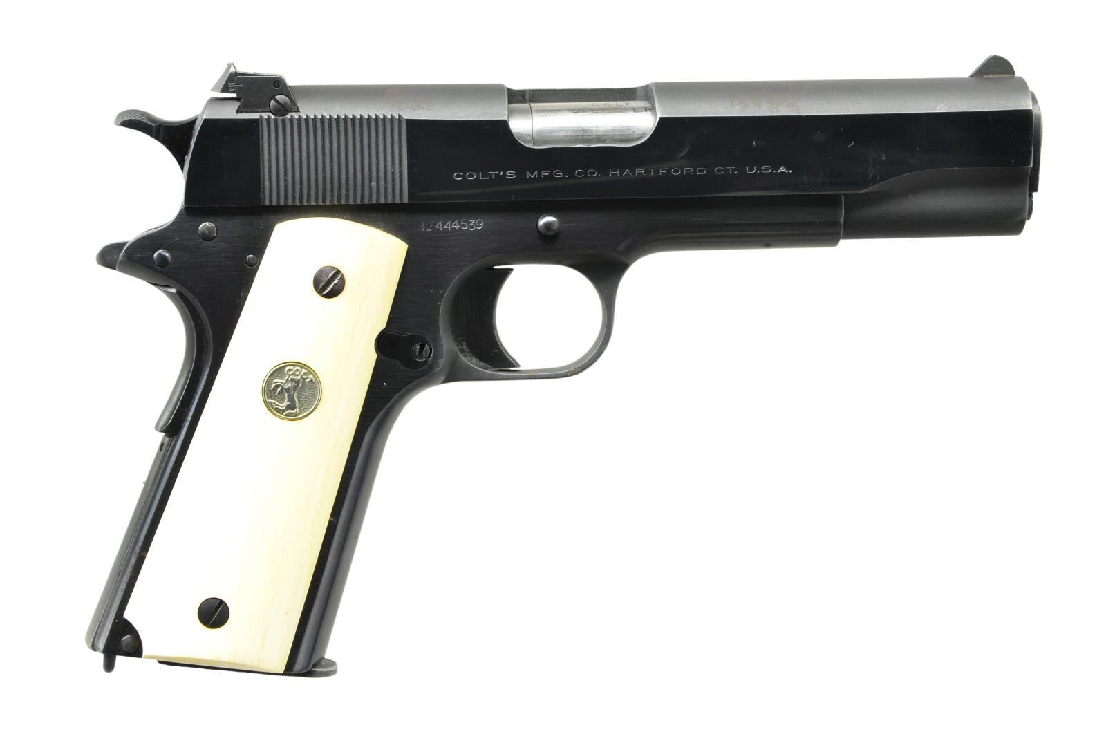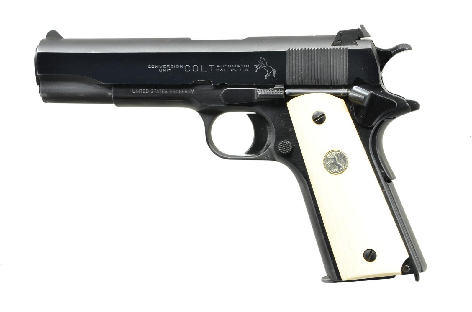 SEMI-AUTO PISTOL. Cal. 22 LR. S# No 444539. Bbl. 5" conversion. Frame mfg. 1918 w/ US markings & proper eagle S 15 proof. Correct frame components & "G" provisional mark on top along w/ "8" by feed ramp. Ivory grips w/ silver Colt medallions. Early conversion unit w/ Coltmaster rear sight & proper checkered slide stop. MAGS: 1 early conversion unit 10 rd. w/ pinned base & aluminum follower. CONDITION: very good plus frame appearance as refinished leaving well preserved markings. Light function wear on trigger. Light scratch from improper slide stop installation. Very good to excellent conversion unit finish w/ slight edge & function wear. Near excellent bore & floating chamber. Exceptionally nice appearing grips w/ grain; 2 screws w/ marred slots. (21-4230/NW). CURIO. $1,000-1,500.