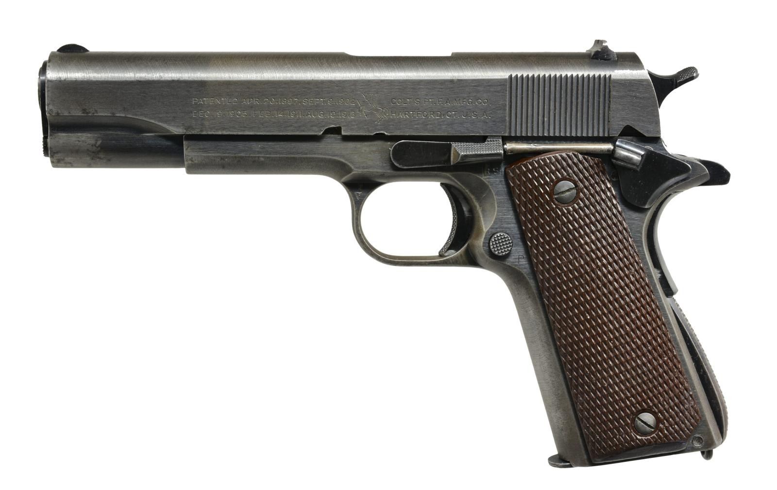 Cal. 45 ACP. S# 728542. Bbl. 5". Shipped April 30, 1941 to Springfield Armory; 2500 units. Boxed "RS" inspector mark by slide stop & on top of frame by disconnector. Original Colt brushed blue finish w/ 2 tone slide appearance. Trigger guard w/ "VP" & "T" on left plus "99" on right. Per Harrison's book, all correct features w/ Type 3 coarse checkered arched mainspring housing having 27 diamonds (not 32). Colt Type 6 bbl. w/ "G" in front of legs. Slide numbered 728537 (not 728542) under firing pin stop. Normal grips are checkered walnut Type 3 or Coltrock Type 4; fitted w/ Coltwood Type 5 having sm. rings & mold #'s. MAGS: 1 very good Colt all blued unmarked 7 rd. UNATTACHED ACCESSORIES: Oct. 24, 2018 dated Colt research letter. CONDITION: good to very good overall appearance w/ thinning finish & holster like high point wear. Hand wear in grip area; grip safety likely replacement w/ vivid blue. Sides of frame under grips appear cleaned of oxidation w/ minimal finish. Occasional light marks including from improper slide stop installation. Portions of front half of slide & frame dust cover have slight spots of cleaned oxidation. Noticeable exterior bbl. functional wear; fair evenly pitted & worn bore. Light peening on 1 bbl. leg. Good plus grips w/ more wear on left. (21-16/NW). CURIO. $1,500-2,000.