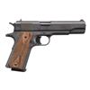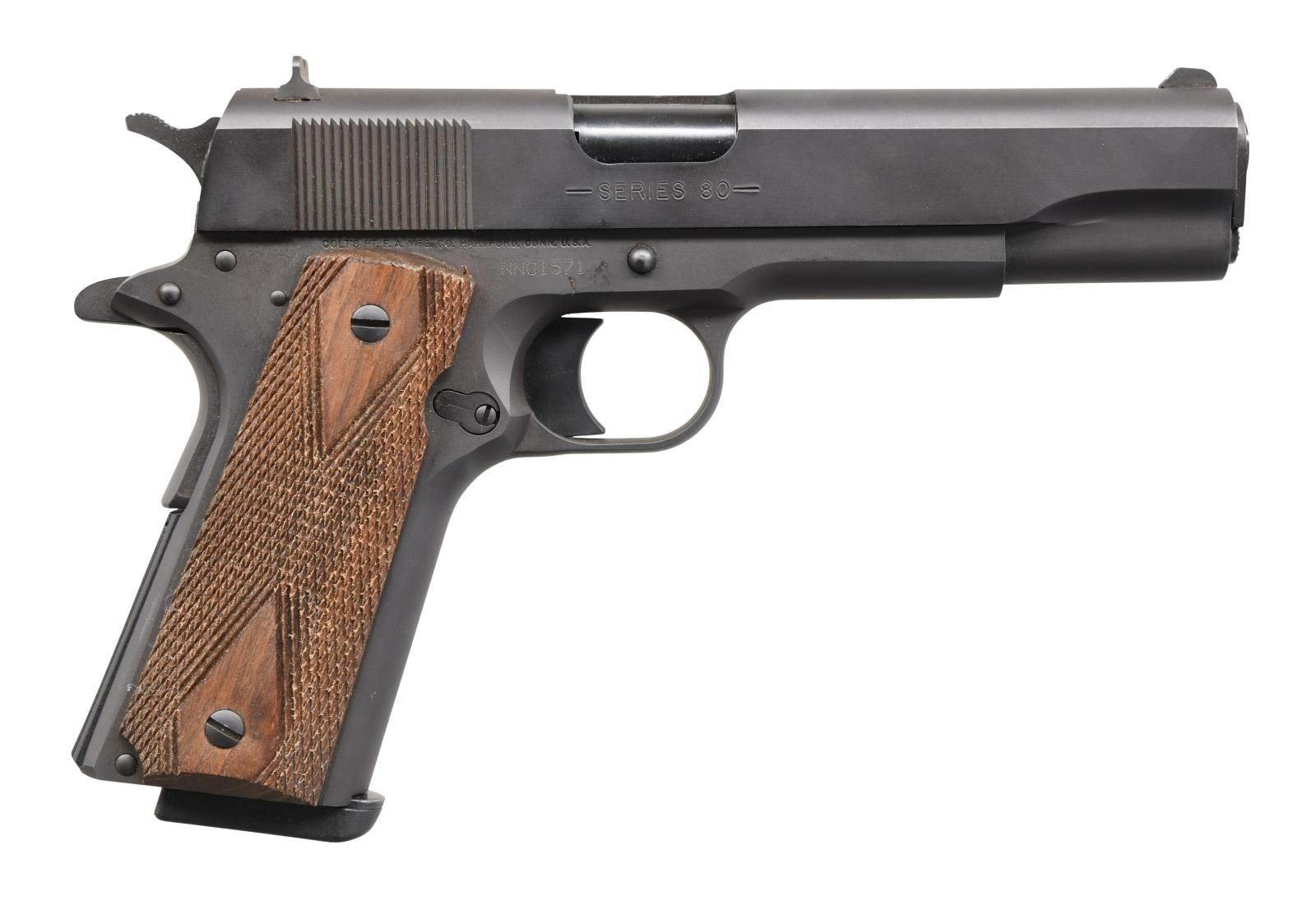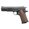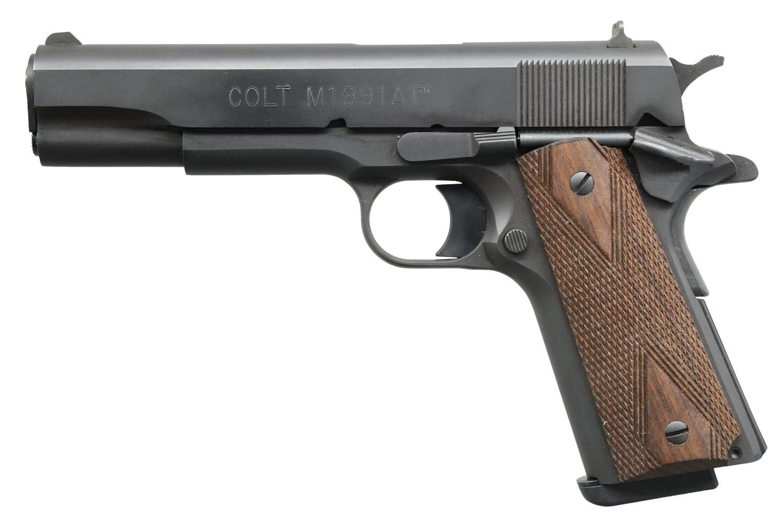 Cal. 9mm Luger. S# NN01571. Bbl. 5" blued. Mfg. 1998 as recreation of military 1911A1 within first batch (1991-2001) having "COLT 1911A1" on left side of slide (only on earliest production); second batch 2015-2016. Also produced in 38 Super and 45 ACP. Matte blued finish resembling parkerizing. Double diamond checkered military style rosewood grips, grooved flat mainspring housing and fixed 3 dot sights (taller than 1911A1's). Trigger is longer style of 1911. MAGS: 1 blued Check-Mate 9 rd. with screw attached black bumper pad. CONDITION: all aspects near excellent including bore; very minimal use with no wear marks. PROVENANCE: The Collection of Gun Sport Ltd owned by Jon R. Thomas. (23-4388/NW). MODERN. $650-900.