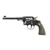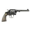 Cal. 38 Long Colt. S# 6924. Bbl. 6" w/ integral half-moon sight blade & “MAR 5, 95” patent date; frame notched rear. Mfg. 1892 w/unusual combination of features. Butt w/out lanyard swivel or markings. Frame yoke numbered 6924 as is cyl. latch. Crane numbered 1878. Left side of frame above grip marked “R.A.C.” as is rear of cyl. Directly above left grip is “L.E.S.” (upside down). Usual grips for period were variations of Colt's checkered hard rubber; later production had checkered walnut as this does w/ gold medallions. Fire blued trigger plus edges of hammer (in the white sides). CONDITION: fair to good general appearance w/ scattered peppery oxidation throughout original finish. Patina in grip area. Fair grips w/ noticeable wear, protruding screw & proud of frame at front. Good to very good bright bore w/ cleaned faint pitting. Mechanical functioning occasionally fails to rotate cyl. & noticeably out of time. PROVENANCE: Estate Collection of Jack Verret Sr. (01-20905/NW). ANTIQUE. $300-500.