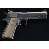 PISTOL. Cal. 45 ACP. S# 845661. Bbl. 5" Springfield Type 13 with horizontal "S P" on left leg (pre WW-II field replacement); "PX-P" above left leg. Mfg. 1942 within Army contract of 55,100 units. Correct features: borderless checkered wide spur hammer, arched Type 3 coarse checkered mainspring housing with lanyard loop, Type 3 spring plug with rnd. detent, checkered thumb safety without under cut, checkered slide stop without under cut, trigger finger clearance cuts, "WB" inspector mark, "VP" on trigger guard, crossed cannons on right rear of frame plus "S" on top of frame. Incorrect features: replacement barrel, pre 70 dark brown checkered plastic grips with rampant Colt logos and large reinforcement rings, replacement slide without serial number or "P" on top yet "H" at rear, AMU style target sights of ramped Patridge blade at front plus Micro adjustable rear, piano wire spring added to spring guide to maintain constant upward barrel pressure, slide slot on right side of frame has small leaf spring at each end to reduce slide movement plus replacement pivoting trigger (1911 profile with short reach) assembly for match accuracy. MAGS: 1 WW-II Risdon 7 rd. CONDITION: good overall appearance as refinished having extra polishing yet markings all readable. Good plus bore with even light frosting. Very good grips with small mark on left. Not C&R due to modifications. (23-5611/NW). MODERN. $450-650.