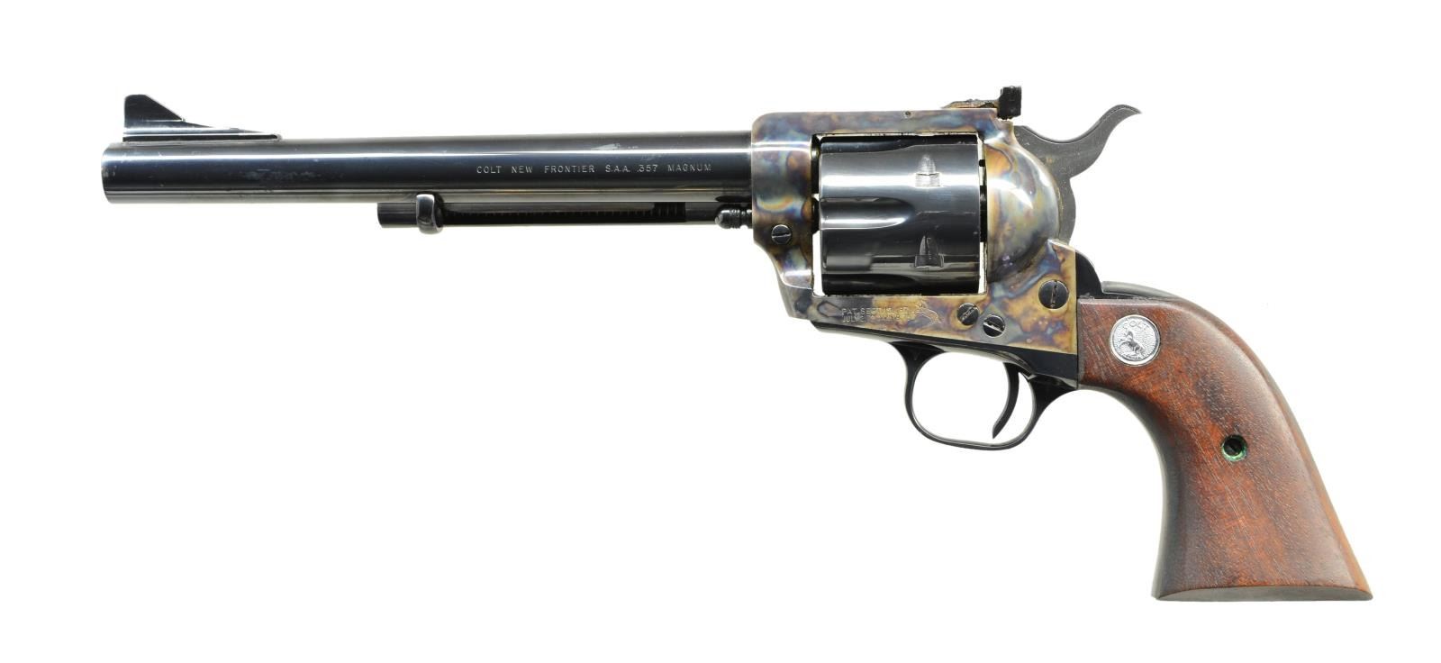 Cal. 357 Mag. S# 3022NF. Made between 1961 & 75, this is essentially the SAA, updated w/ heavier top strap to case hardened action w/ adj. rear & tall target front sights. Top of 7 1/2" bbl. is marked "COLT'S PT. FA. MFG. Co. HARTFORD CT. U.S.A.". Model & cal. are on left side. Case hardened action has usual SAA patent dates & rampant colt on left side. Hammer profile is slightly lowered to more easily view sights. Grip straps are blued & grips are oil finished walnut. UNATTACHED ACCESSORIES: a blue Colt factory box, heavily taped on all edges & corners. CONDITION: exceptionally fine, close to "as new", possibly unfired. Retaining nearly all factory finishes w/ a little noticeable wear & a few handling marks except for faint bolt drag line on cyl. & a sm. patch of freckling on edge of loading gate. (22-2091/MGM). CURIO. $1,700-2,100.