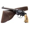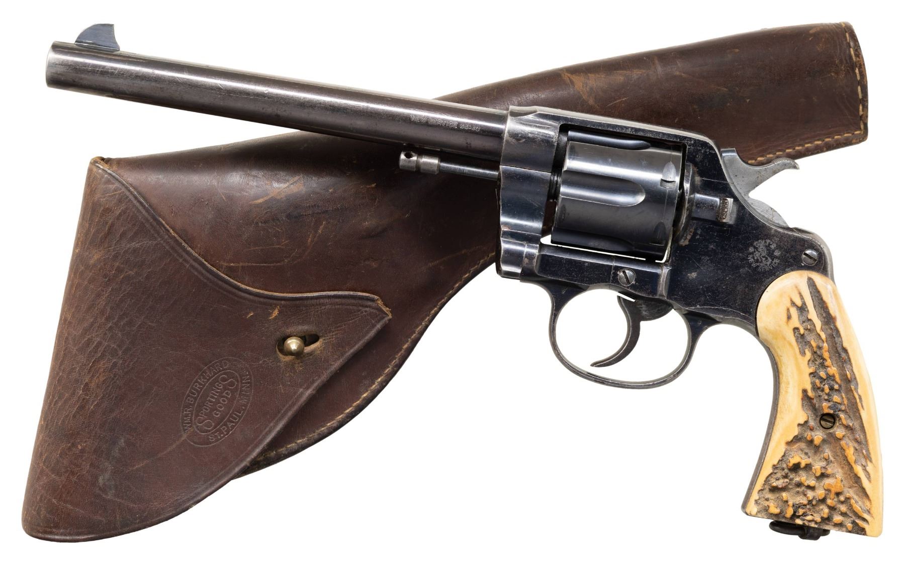HOLSTER. Cal. 44-40. S# 16063. Bbl. 7 1/2". New Service double action revolver mfg. by Colt in 1906. Let side of the bbl. is marked "NEW SERVICE 44-40", with Colt's 2-line mfg. and patent information marked across the top. Left side of the frame is marked with the Rampant Colt logo between "(MALTESE CROSS) COLT'S (MALTESE CROSS)/ NEW SERVICE". Metal components exhibit a blue finish overall, save for on the sides of the hammer, which are polished in-the-white. Frame is mounted with 2-piece stag grips, featuring a lanyard swivel and ring on the butt. Standard clipped blade front sight and frame notched rear sight. Matching numbers are present on the frame and cyl. crane. UNATTACHED ACCESSORIES: brown leather holster marked "WM.R.BURKHARD/ SPORTING/ GOODS/ ST. PAUL. MINN" on the closure flap, with "308" marked on the rear of the belt loop. CONDITION: metal components retain good amounts of their original factory blue finish, exhibiting areas of wear and thinning that are fading to gray patina, scattered superficial handling marks, as well as scattered spots of light surface oxidation overall. Grip straps have faded to a mottled gray patina. Bore is bright, exhibiting some scattered spots of light to mild pitting, while retaining strong rifling throughout. Proper manual mechanics. Grips exhibit an aged yellow appearance, but otherwise remain sound. Holster remains malleable, exhibiting scattered spots/areas of age related cracking and crazing. (25-5053/MLW). CURIO. $800-1,200.