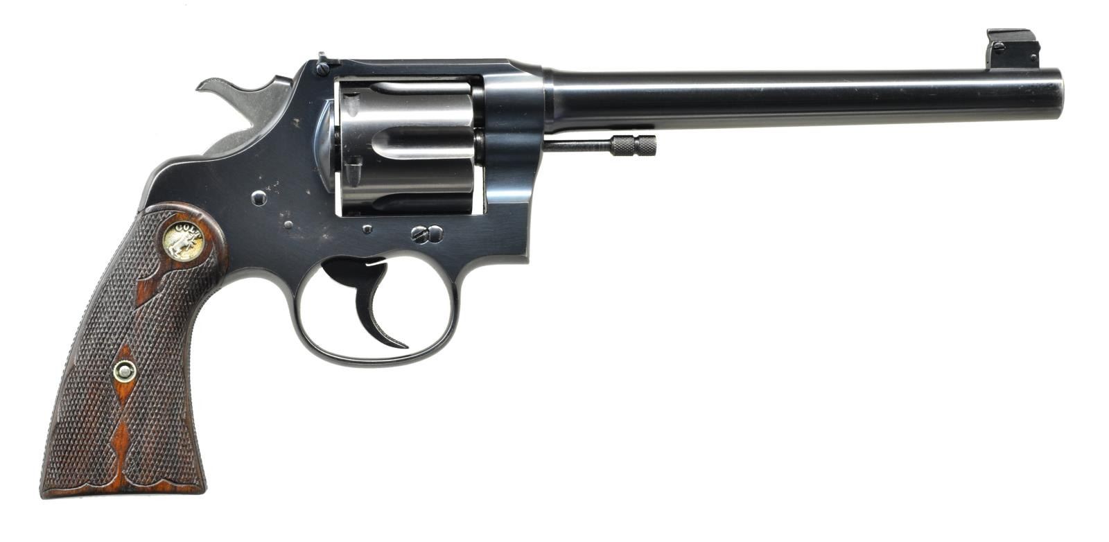Cal. 45 LC. S# 305681. Bbl. 7 1/2" w/ elevation adj. blued bead (not patridge) front sight blade & corresponding windage adj. frame mounted rear. Mfg.1919 (1898-1944) w/ mixture of improved & standard features. Early checkered squared cyl. latch & leaf spring for hammer & trigger. Floating firing pin, knurled ejector rod head plus checkered grip straps, trigger face & hammer spur. Checkered walnut grips w/ scallop & diamond borders plus silver Colt medallions. Similar to Shooting Master model (3500 mfg. 330,000-350,000) but earlier production w/ longer bbl. (6" for Master). CONDITION: very light thinning at muzzle (mostly left side); extremely faint beginning thinning at various high points. Right side of frame behind recoil shield has 2 bright spots & some stain like appearing peppery oxidation spots. Very slight spots of staining on sides of hammer. Balance of metal finish close to near excellent & certainly collector quality. Near excellent bore, grips & chambers w/ close to unfired appearance having no internal frame residue plus clean unmarked recoil shield face & face of cyl. Smooth early Colt workmanship. PROVENANCE: Estate Collection of Kenneth Horn (Grandson of JC Higgins). (22-428/NW). CURIO. $2,000-3,000.