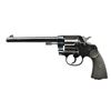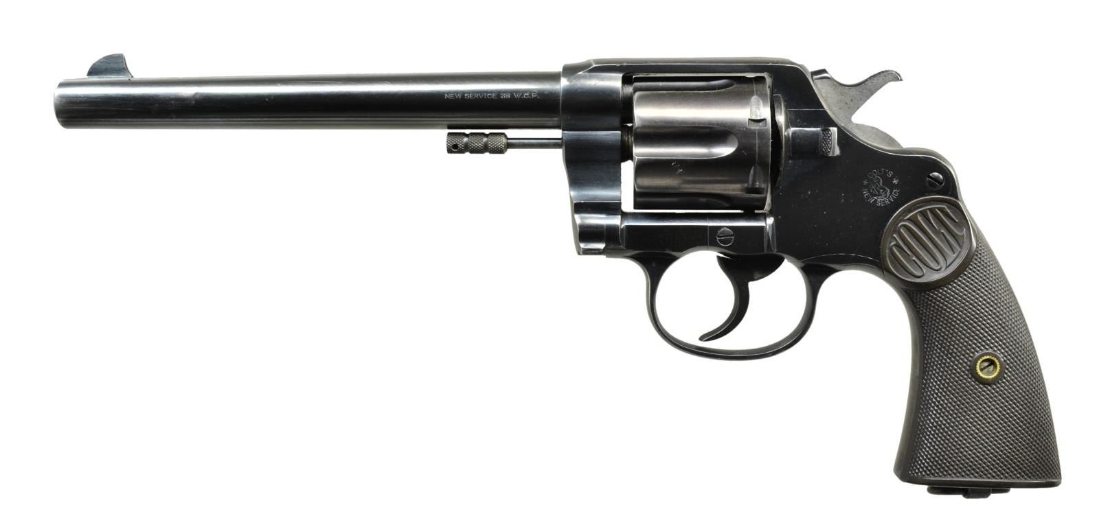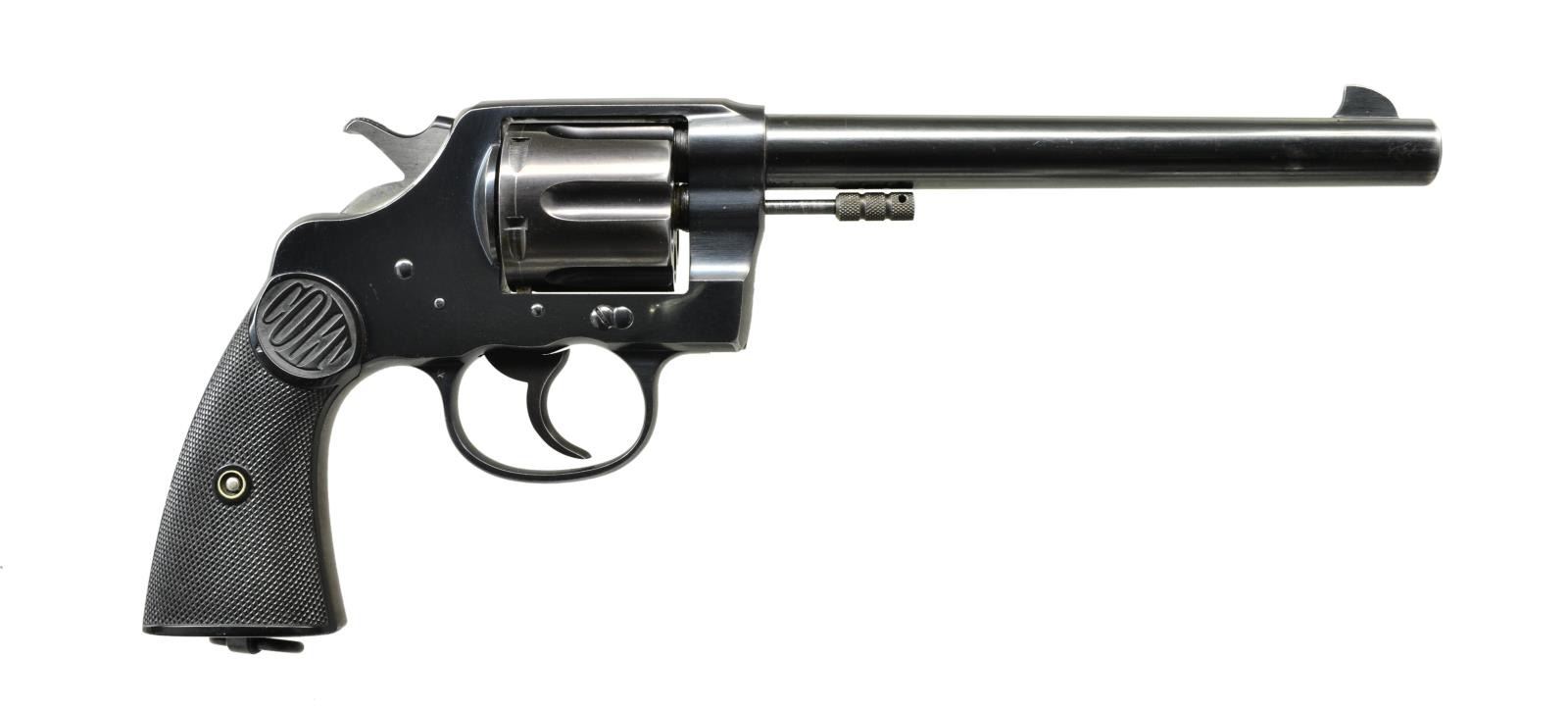 Cal. 38 WCF (38-40). S# 17705. Bbl. 7 1/2" w/ blade sight & corresponding notched frame. Mfg. 1907 (1898-1944) w/ blued finish & checkered Colt hard rubber grips plus lanyard swivel at butt. Early variation w/ checkered square cyl. latch & circled Colt marking on sideplate. Matching numbered sideplate & cyl. latch. Left side of frame under grip & bottom of bbl. numbered 231B. Double grooved ejector rod head having crossed drilled hole near front; throw limited to 11/16". CONDITION: very good overall appearance w/ spots of finish loss on front portion of bbl. & some high points of cyl. Occasional spots of peppery oxidation noticeable on rear of top strap & occasionally on cyl. Markings & finish indicate replacement bbl. on refinished frame that has lock work components blued that are normally in the white. Flat areas of frame are bright blue but edged contours w/ less gloss. Likely Colt work as indicated by matching numbers on bbl. & butt. Good to very good grips w/ even hand wear; right grip best appearing. Very good bore w/ light cleaned frosting plus near excellent chambers. PROVENANCE: Estate Collection of Kenneth Horn (Grandson of JC Higgins). (22-420/NW). CURIO. $900-1,400.
