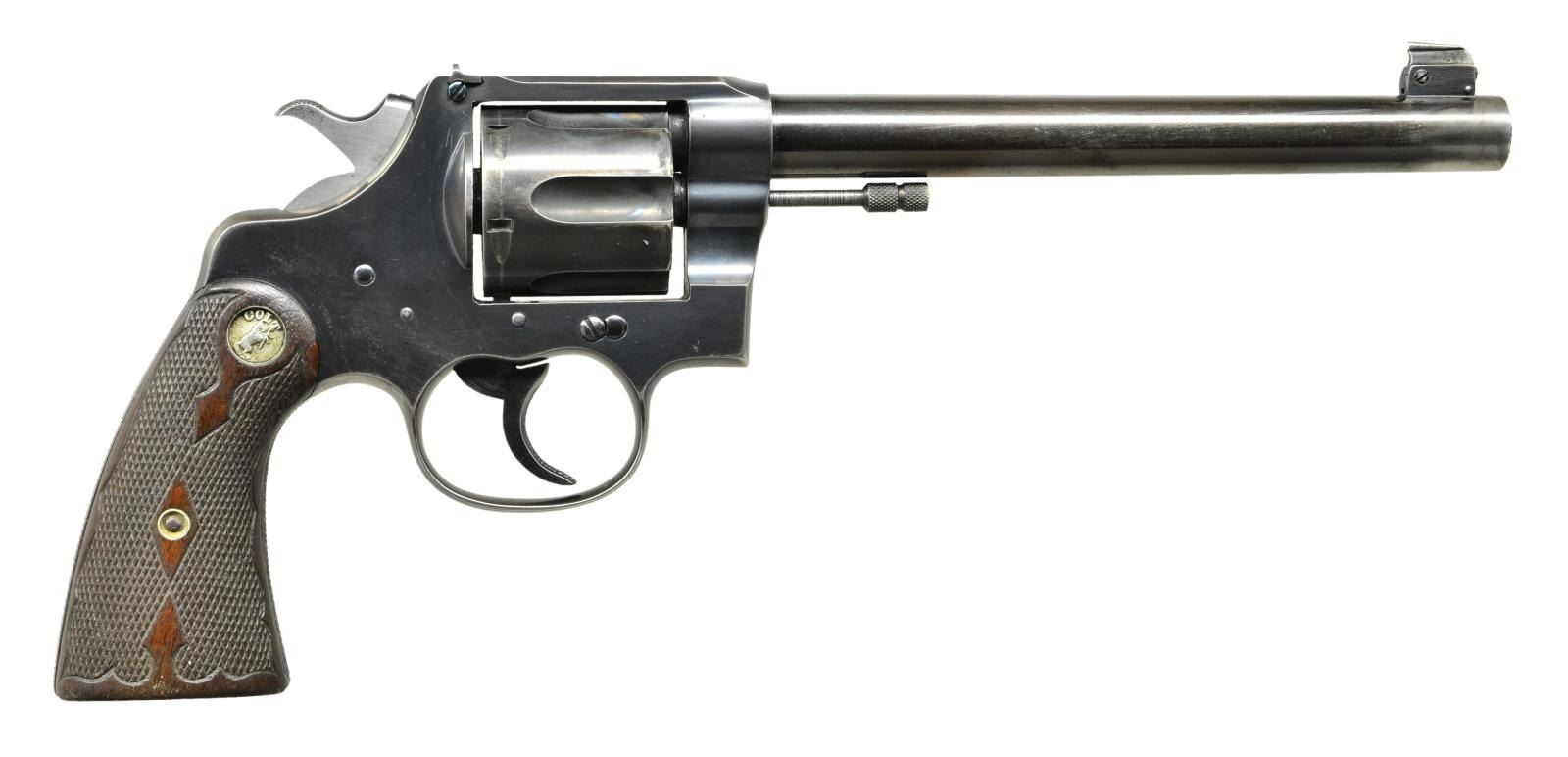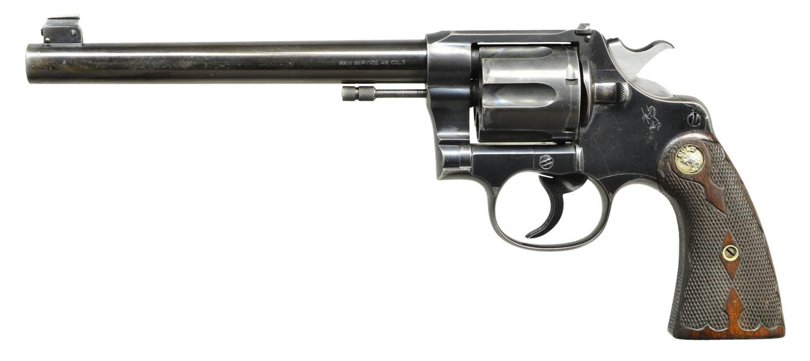 Cal. 45 Colt. S # 305647. Bbl. 6 inch. Beaded blade adjustable front sight with U notch adjustable rear sight, Flat top action. Six shot swing out cylinder. Checkered grip straps and trigger. Blue finish with polished hammer sides. 2 Piece walnut grips with fancy hand checkering and silver rampant colt medallions. UNATTACHED ACCESSORIES: Colt Archive Properties letter giving the following information: “COLT NEW SERVICE TARGET REVOLVER. Serial Number: .45/C., Bbl. Length: 7 1/2”, Finish: Blue, Type of Stocks: Not Listed, Sold To: N. Hermes, Address: Unavailable, Shipped To: Townley Metal and Hardware Company, Address: Kansas City, Missouri, Date of Shipment: January 3, 1920, Number of Same Type Guns in Shipment: one.” CONDITION: 70% lightly faded blue shows carry and edge wear with small dents on the sideplate grips show moderate finish and checkering wear. Sound mechanics. Bore retains sound rifling showing some fouling. (22-3070/DS). CURIO. $1,750-2,500.