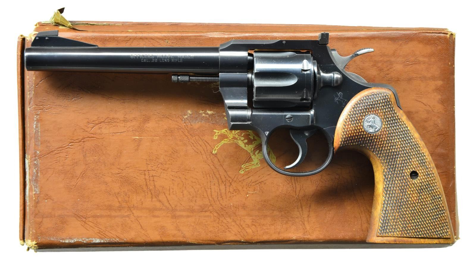 Cal. 22 LR. S# 65718. Bbl. 6" rnd. tapered heavy. Ramp mounted Patridge front sight w/ square notch adj. rear sight. Six shot fluted cyl. Blue finish. Wide checkered spur hammer w/ polished sides. Added checkered walnut target grips w/ silver rampant colt medallions. Mfg. 1953. UNATTACHED ACCESSORIES: one piece box w/ unnumbered matching label. Box contains Colt handbook, "Handling the Handgun" pamphlet, test target w/ matching number, Colt circular screw driver, & original checkered Coltwood grips w/ silver rampant colt medallions. CONDITION: over 90% blue showing muzzle & edge wear w/ cyl. drag line. Target grips have good refinish. Sound mechanics. Bright near excellent bore. (22-1089/DS). CURIO. $1,000-1,500.