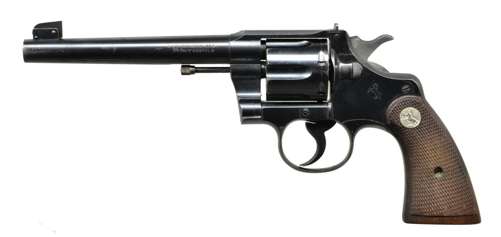 BARREL DA REVOLVER. Cal. 38 Spl. S# 600024 (1936). Bbl. 6" w/ adj. blade front sight & drift adj. rear sight. Blue finished w/ 6 shot fluted swing out cyl. 2 Piece checkered walnut grips w/ Colt medallions. Back strap is checkered. CONDITION: good to very good overall w/ wear, cyl. turn line, marks & spots of oxidation. Very good bore w/ fouling near cyl. (22-2007/MD). CURIO. $650-900.