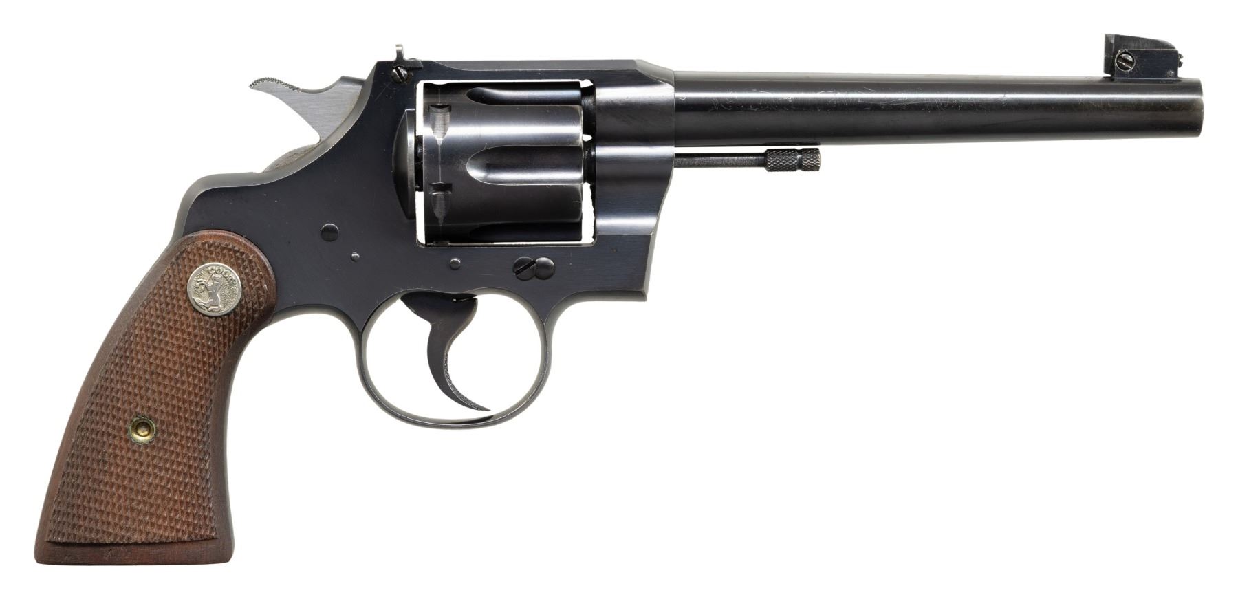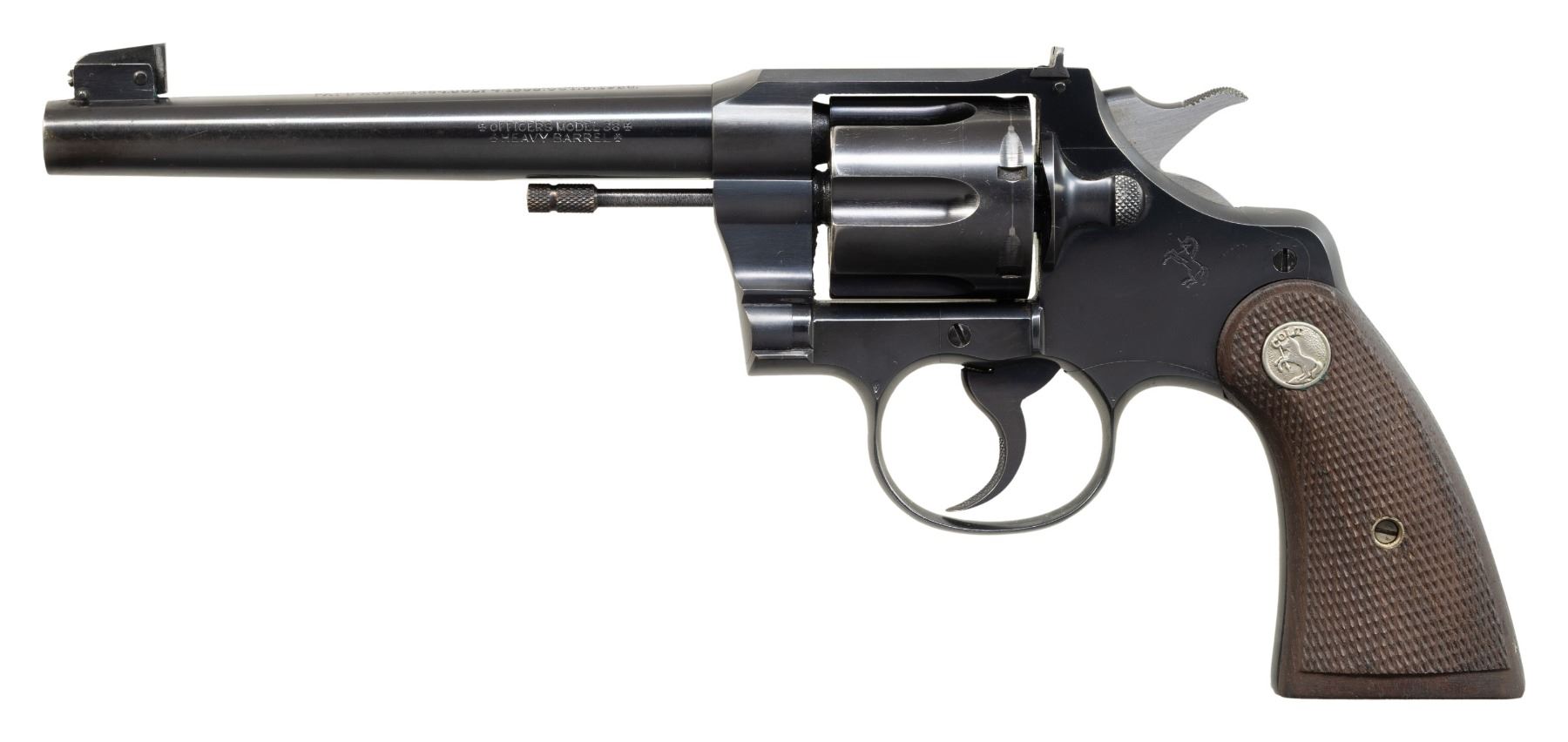 REVOLVER. Cal. 38 Spl. S# 620737. Bbl. 6". Officers Model .38 Heavy Barrel double action revolver mfg. by Colt in 1937 (serialized in sequence with the Official Police revolver). Left side of the bbl. is marked "OFFICERS MODEL 38/ HEAVY BARREL" (both lines between Maltese crosses), with Colt's 2-line mfg. and patent information marked across the top. Left side of the frame is marked with the Rampant Colt logo. Metal components exhibit a blue finish overall, with the top and rear straps of the frame exhibiting a matte blue finish. Sides of the hammer are polished in-the-white. Frame is mounted with 2-piece Colt silver medallion checkered wood grips. Patridge blade front sight with dovetailed adj. square notch rear sight. Checkered trigger and back strap. Matching numbers are present on the frame and cyl. crane. CONDITION: metal components retain the majority of their original factory blue finish, exhibiting light to mild edge wear and scattered light superficial handling marks overall. Mirror bore, retaining strong rifling throughout. Proper manual mechanics. Grips show some light smoothing, but otherwise remain very good overall. (25-5115/MLW). CURIO. $600-900.