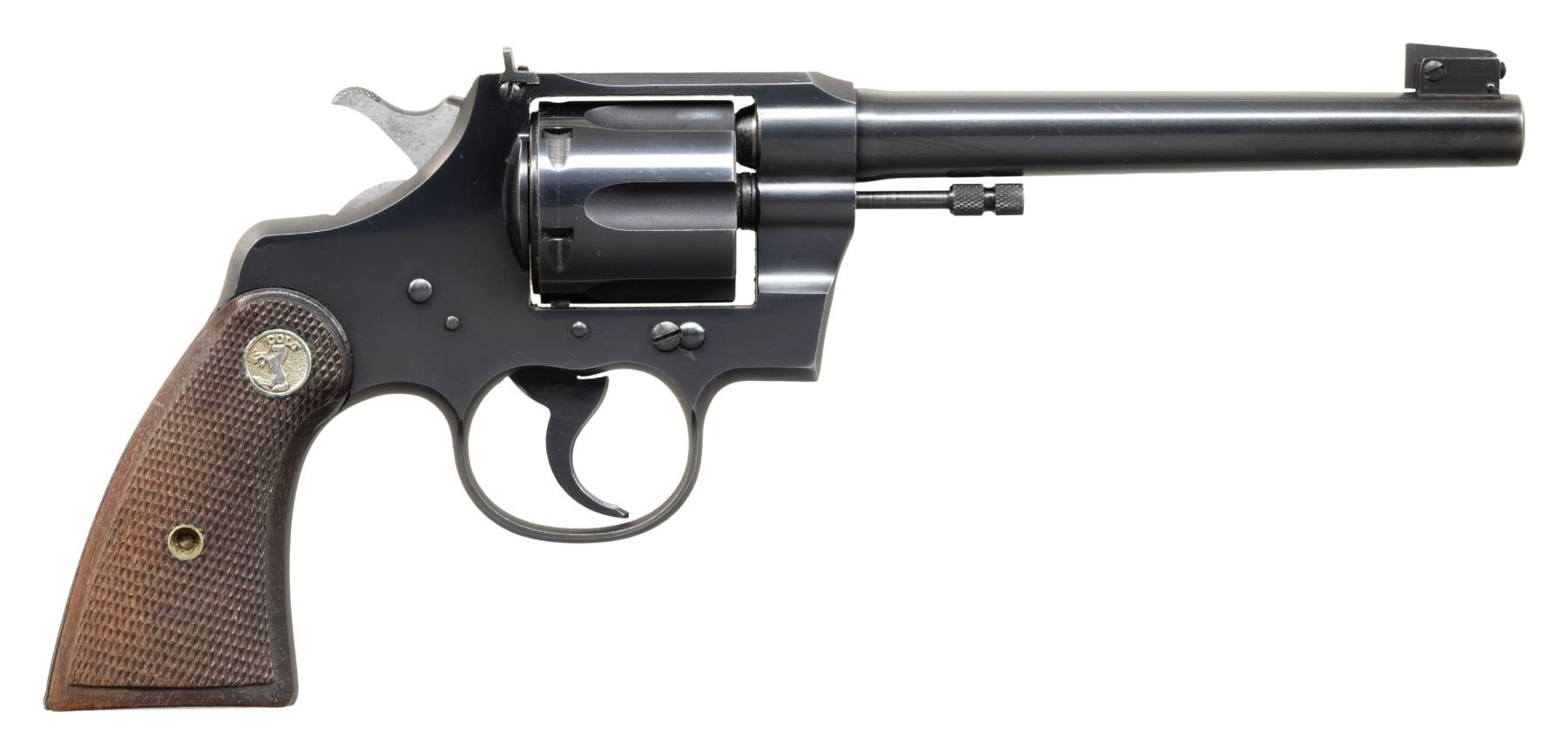 REVOLVER. Cal. 22 LR. S# 51456. Bbl. 6". Officers Model Target double action revolver mfg. by Colt in 1948. The left side of the bbl. is marked "OFFICERS MODEL TARGET/ .22 LONG RIFLE CTG.", with Colt's single line address marked across the top. Left side of the frame is marked with the Rampant Colt logo. Metal components exhibit a blue finish overall, with the top, rear, and bottom straps of the frame, as well as the cyl. flutes exhibiting a matte blue finish. Sides of the hammer are polished in-the-white. Frame is mounted with 2-piece Colt silver medallion checkered wood grips. Patridge blade front sight with adj. square notch rear sight. Grooved trigger and rear grip strap. Matching numbers are present on the frame and cyl. crane. CONDITION: metal components retain the majority of their original factory blue finish, exhibiting some light edge wear, with some scattered handling marks and spots of light surface oxidation. Sides of bbl. exhibit mild wear and thinning fading to gray patina along the edges of the muzzle. Mirror bore, retaining well defined rifling throughout. Proper manual mechanics. Grips show some mild smoothing and a few nicks to the diamonds, but otherwise remain sound. (25-5116/MLW). CURIO. $600-900.