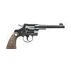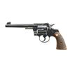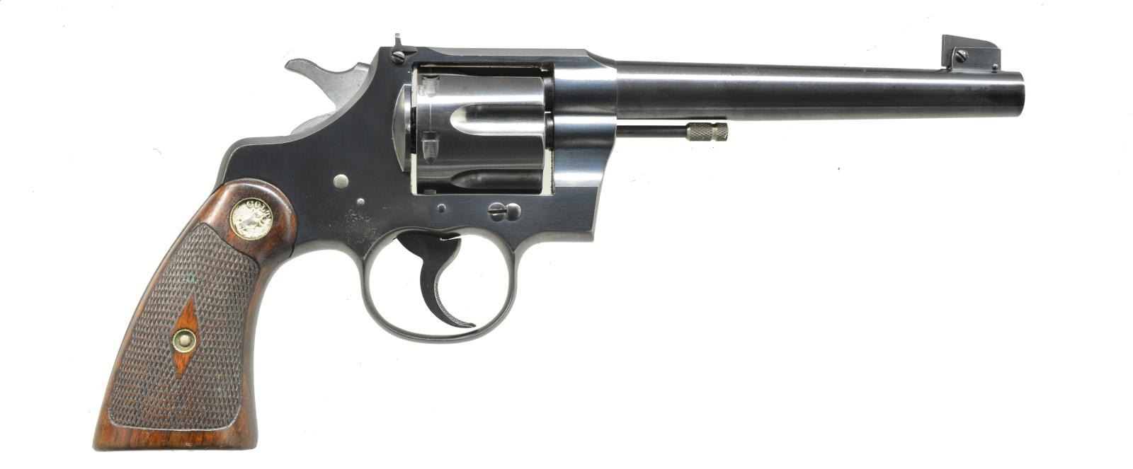 DA REVOLVER. Cal. 38 Spl. S# 606032. Bbl. 6" w/ blade front sight & square notch adj. rear sight. 6 Shot fluted cyl. Blue finish. 2 Piece diamond checkered walnut grips. 1937 Mfg. CONDITION: over 95% blue w/ cyl. drag line showing spots of corrosion on frame & butt. Grips have worn finish showing scratches & marks. Bright bore w/ strong rifling. (20-3731/DS). CURIO. $600-900.