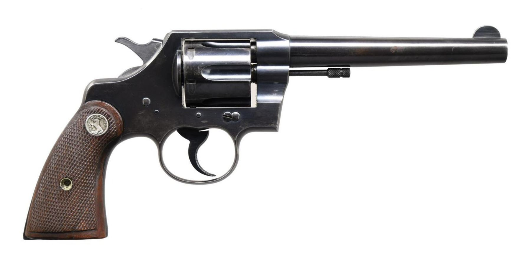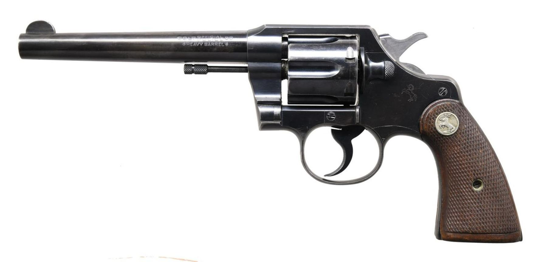 REVOLVER. Cal. 38 Spl. S# 645837. Bbl. 6". Official Police heavy barrel double action revolver mfg. by Colt in 1940. The left side of the bbl. is marked with the model and cal. designations above "*HEAVY BARREL*", with Colt's mfg. and patent information marked across the top. The left side of the frame exhibits the Rampant Colt logo and "VP" proof. Metal components exhibit a blued finish, with the frame being mounted with 2-piece Colt silver medallion checkered wood grips. Half-moon blade front sight with frame notched rear sight. CONDITION: metal components retain large amounts of their original factory blue finish, exhibiting areas of wear and thinning that show through to gray patina, with some scattered spots of light surface oxidation overall. Bbl. has been touched up slightly at the muzzle, and exhibits some light pitting on the left side of the front sight. Mirror bore, exhibiting some light pitting and oxidation towards the muzzle and retaining well defined rifling throughout. Grips show mild smoothing, some scattered handling marks, and some chipping along the edges, but otherwise remain sturdy and serviceable. Right grip panel exhibits a replaced section at the bottom right side of the panel, which is almost unnoticeable exterior. (23-5163/MLW). CURIO. $600-900.