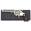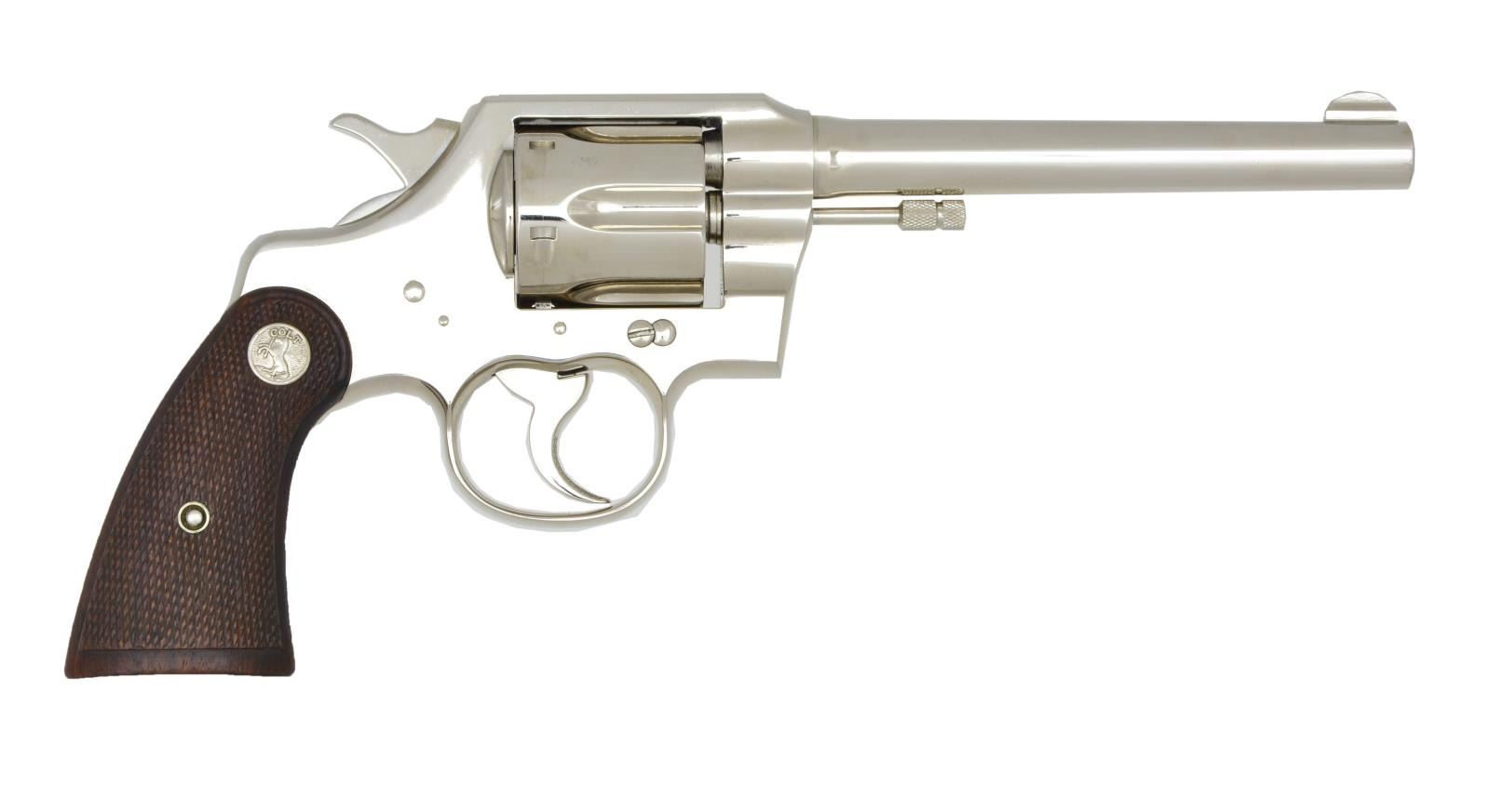 Cal. 22 LR. S# 3584. Bbl. 6" w/ integral semi-circular front sight. Six shot fluted cyl. Full nickel finish. Two piece checkered walnut grips w/ silver rampant colt medallions. Mfg. 1933 w/ 1926 last bbl. patent date. UNATTACHED ACCESSORIES: one piece box w/ hinged lid. Bottom has s# in pencil (possibly changed). End flap label has added stickers showing 6" & 22 cal. w/ additional sticker marked "FRANKFURTH HDW. CO. / MILWAUKEE". Box contains; Special Instructions, Shooting Instruction & Unerring Accuracy pamphlets. CONDITION: gun retains over 98% nickel finish showing faint cyl. dragline. Inside of top strap above bbl. has firing residue. Grips show light wear w/ scattered sm. marks. Right grip has light scratch at butt. Sound mechanics. Near excellent bright bore. (22-1105/ZAL). CURIO. $1,000-2,000.