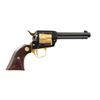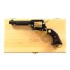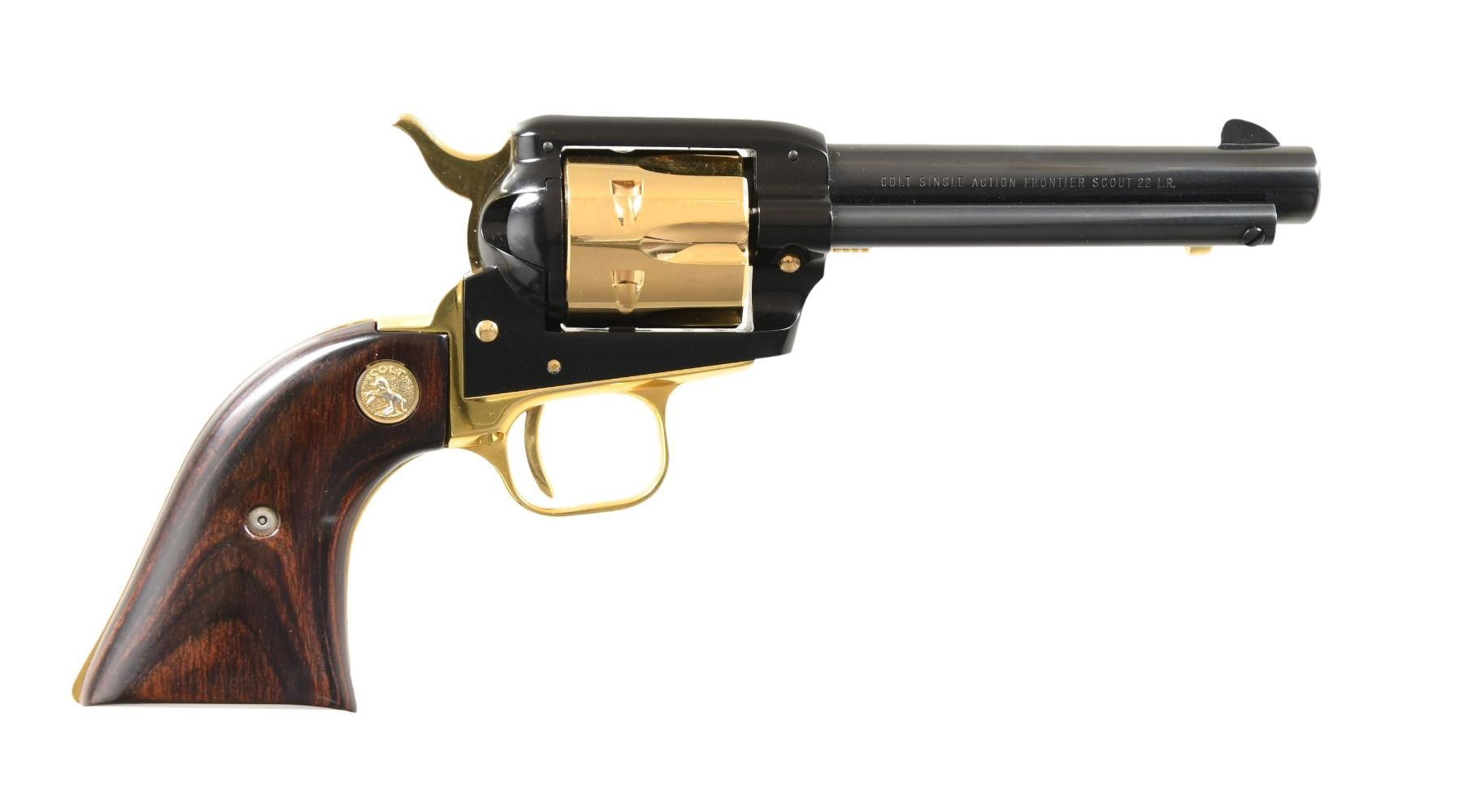 REVOLVER. Cal. 22 LR. S# 441OK. Bbl. 4 3/4" with blade sight plus fame notched rear. Mfg. 1966 (per Colt references); 1,343 units. Gold plated fluted cylinder, grip frame, trigger, hammer, ejector rod head, base pin and all screws except ejector housing; balance is blued. Light scroll engraving on butt. Smooth laminated hardwood gloss finished grips with gold Colt medallions and nickeled grip screw. Barrel dates of 1890 and 1965; gold filled markings. UNATTACHED ACCESSORIES: light colored Colt branded wood presentation case having pioneer woman image on lid. Red interior with corduroy outlined base plus satin with gold rampant Colt under lid; multiple light marks on case. CONDITION: all aspects near excellent appearing new and unfired. (24-4798/NW). CURIO. $500-750.
