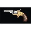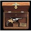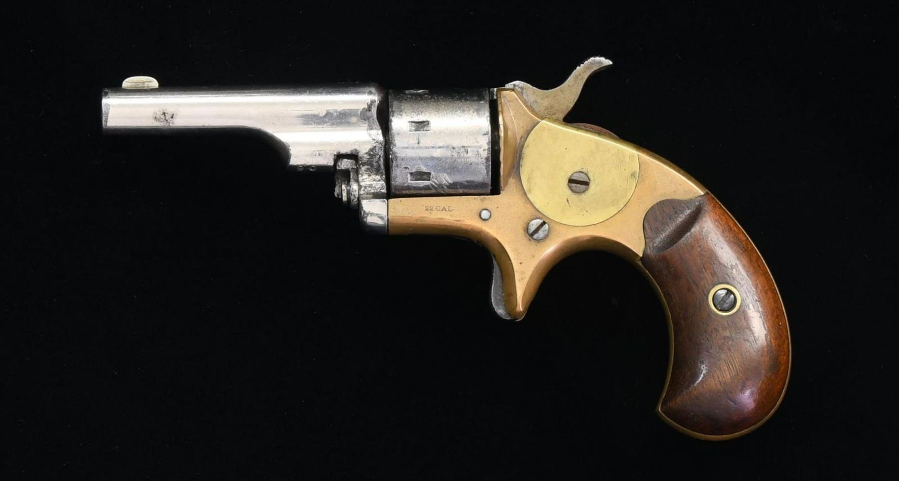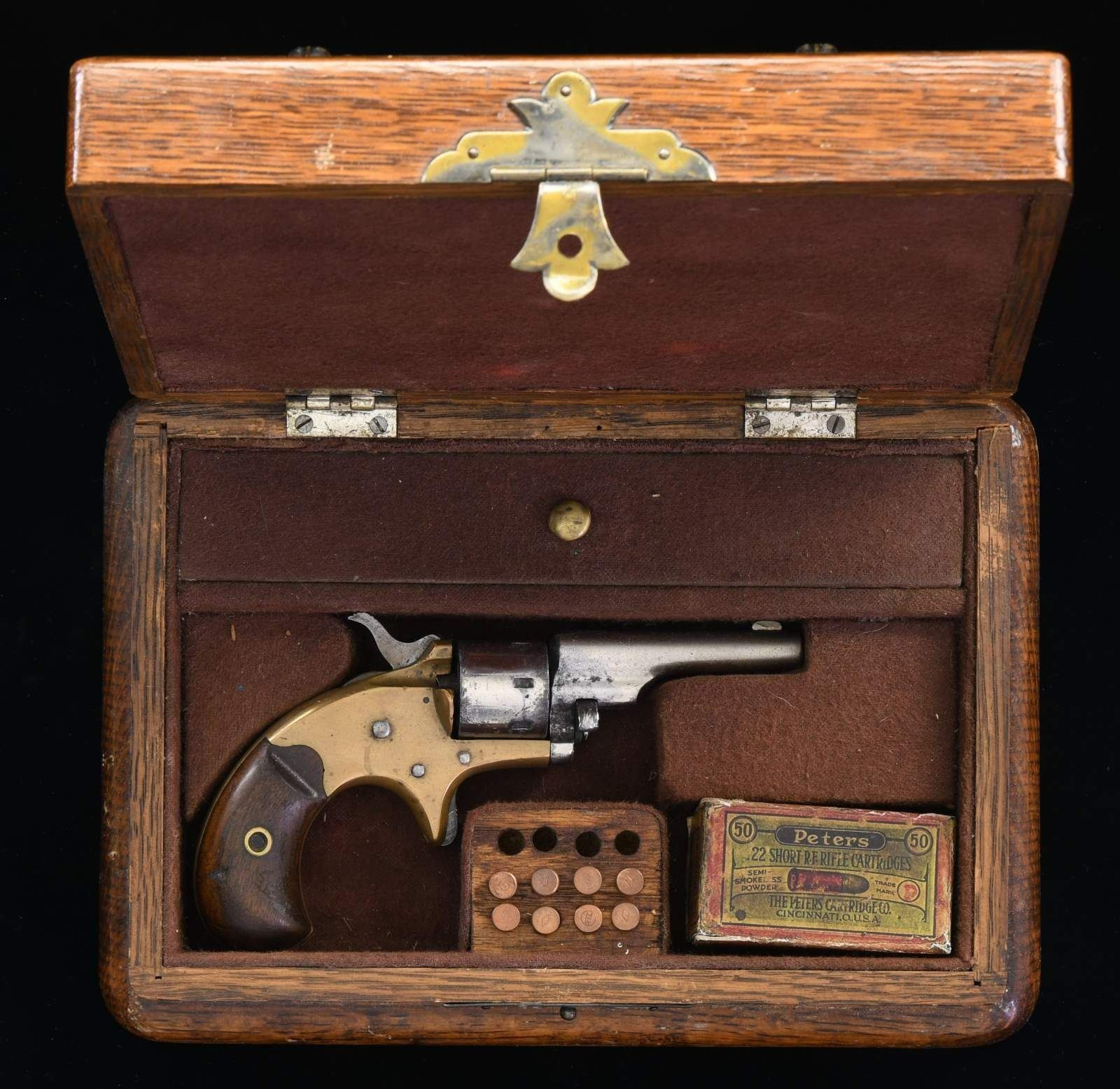 Cal. 22 RF. S# 90034. Bbl. 2 3/8". Open Top Pocket revolver mfg. by Colt in 1876. The top of the bbl. is marked with Colt's mfg. information, with "22 CAL" marked on the left side of the frame. Brass frame with nickel plated bbl. and cyl. Frame is mounted with 2 piece smooth wood birds head grips. Matching numbers are present on the frame and bbl. Cyl. appears to be matching, with most numbers being illegible. UNATTACHED ACCESSORIES: wood case featuring a brown felt interior and containing an ivory handled cleaning rod as well as a reproduction box of various vintage .22 Short ammunition. CONDITION: brass frame has been cleaned at one time, exhibiting some areas of verdigris and some patina. Bbl. and cyl. retain large amounts of their original factory nickel plated finish, exhibiting areas of flaking and dark oxidation. Bore exhibits pitting and good rifling throughout. Grips show some scattered marks and impressions, but otherwise remains sturdy and serviceable. Action is slightly out of time. Case exhibits flaking to its varnish and a few marks from handling and storage, but is otherwise good. (01-24652/MLW). ANTIQUE. $300-400.