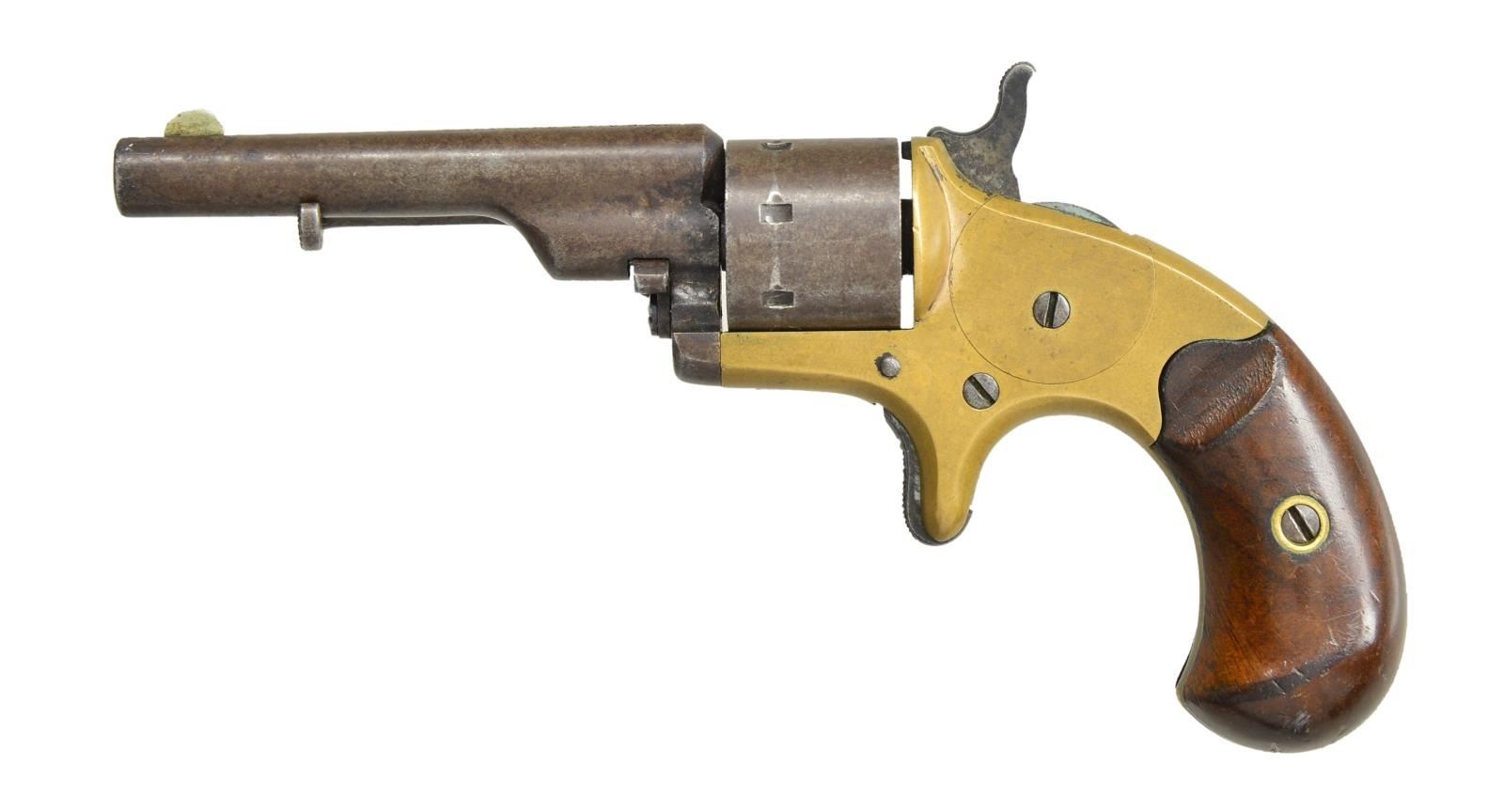Cal. 22 Short or Long. S# 1544. Bbl. 2 7/8" rnd. w/ semi circular German silver front sight. Early model w/ ejector in integral housing. High spur hammer. Seven shot rnd. cyl. Brass frame w/ checkered spur trigger. Blue finish w/ silver finished frame & case colored hammer. Two piece walnut bird's head grips. About 114,200 mfg. 1871-1877. CONDITION: bbl. & cyl. finish has faded to smooth brown patina. Frame has faded to a pleasing mustard patina showing faint traces of silver finish. Grips show moderate wear w/ scattered handling marks. Functioning mechanics w/ light spring tension. Lightly pitted bore retaining intact rifling. (01-20601/DS). ANTIQUE. $700-1,100.