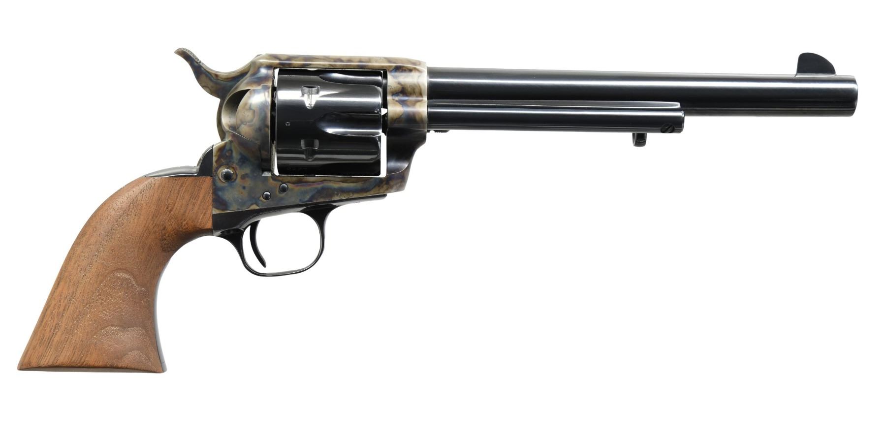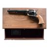 Cal. 45 Colt. S#. PC1265. Bbl. 7 1/2" marked "1873 PEACEMAKER CENTENNIAL 1973". 6 shot fluted cyl. blue & case colored finish. I piece walnut grip w/ cartouche on left panel. 2nd gen. revolver, limited edition of 1500 mfg. in 1975. UNATTACHED ACCESORIES: Walnut case w/ fitted slide out drawer. Inside lid has Sam Colt portrait. case contains key. case exterior shows handling marks. CONDITION: Near excellent, appears unfired. (24-5640/DS). MODERN.$1600-2400.