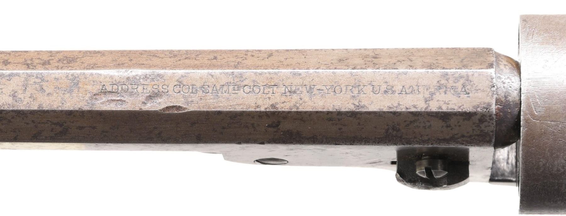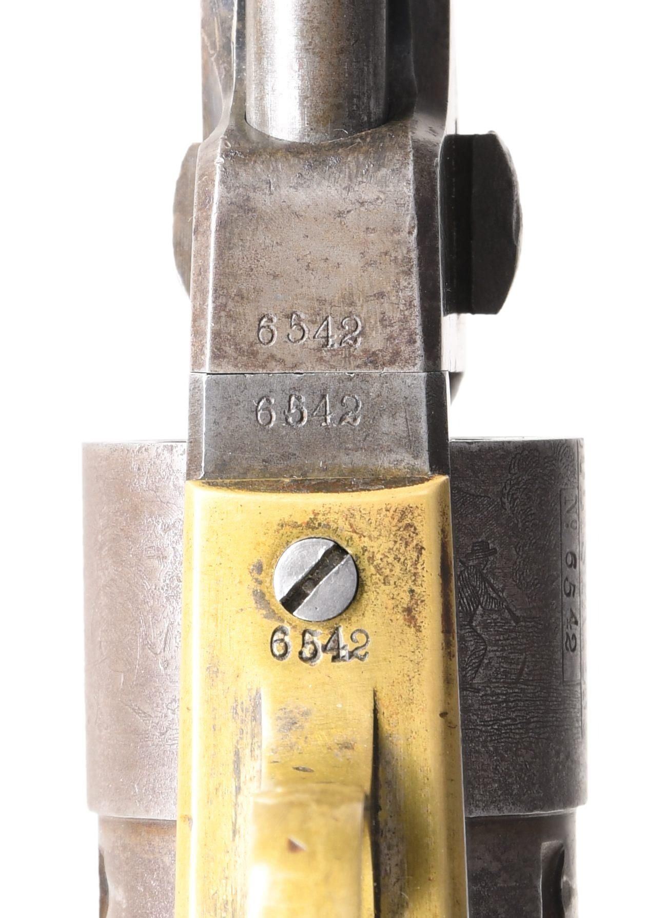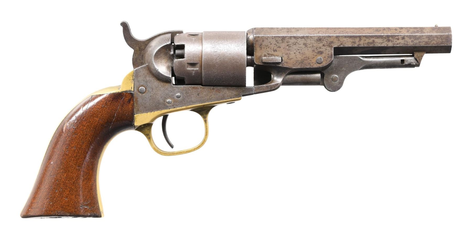 Cal. 36. SN. 6542. Bbl. 4 1/2" octagon w/ New York address & brass sight. Round rebated 6 shot cyl. w/ stage coach scene roll engraving. Original finish was blue & case colored w/ silver plated brass grip straps. Bbl., frame, grip straps, cyl. & wedge have matching numbers. One piece walnut grips. under 22,000 mfg. 1863 or 1865 to approx. 1872. CONDITION: metal has faded to gray w/ spots of very light pitting. Brass grip straps retains faint traces of silver plating. Cyl has lightly visible scene. Grips show light wear & marks w/ dents at butt of right panel. Action is sound. Bore retains good rifling showing spots of pitting. (01-25376/DS). ANTIQUE. $1400-1800.